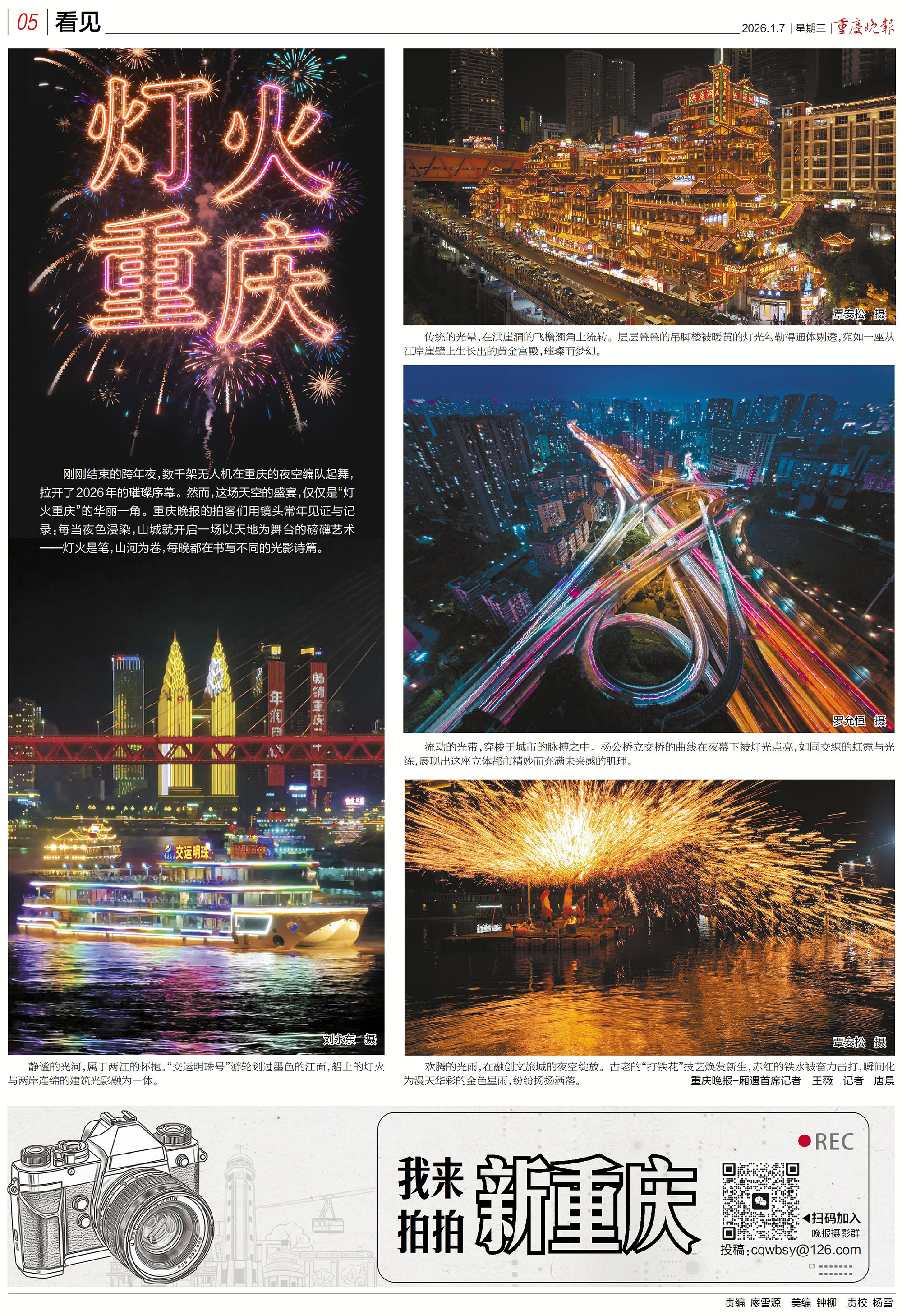 刚刚结束的跨年夜,数千架无人机在重庆的夜空编队起舞,拉开了2026年的璀璨序幕。然而,这场天空的盛宴,仅仅是“灯火重庆”的华丽一角。重庆晚报的拍客们用镜头常年见证与记录:每当夜色浸染,山城就开启一场以天地为舞台的磅礴艺术——灯火是笔,山河为卷,每晚都在书写不同的光影诗篇。