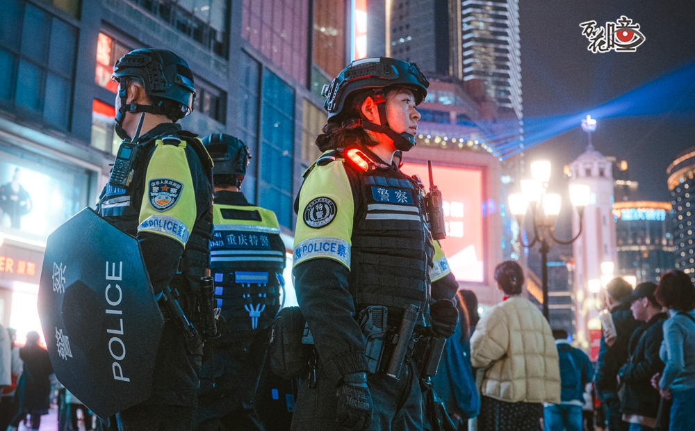 夜幕降临,解放碑商圈人声鼎沸,拥挤的人流中,全副武装、肩灯闪烁的女特警队员们成为显眼的路标。