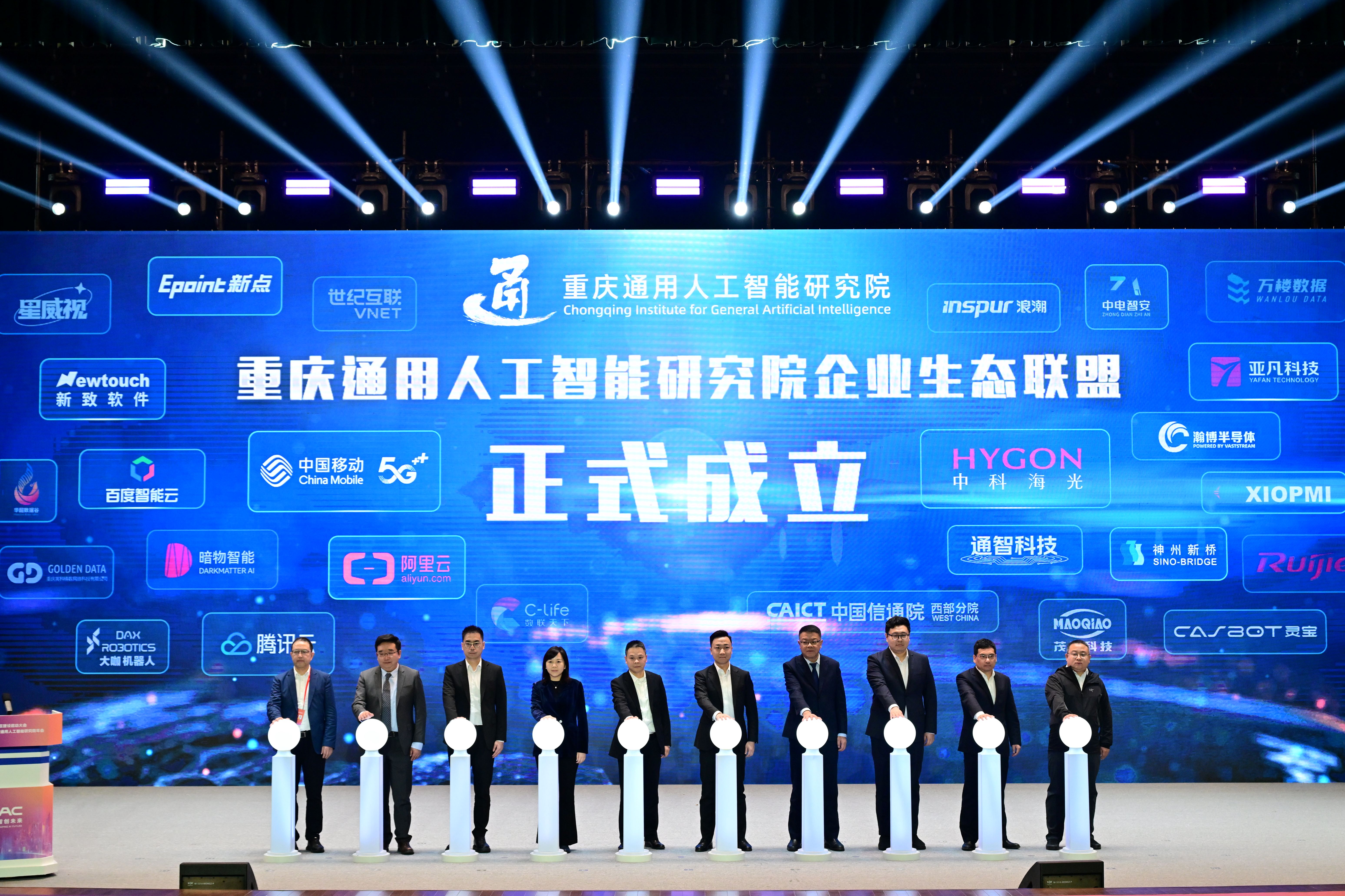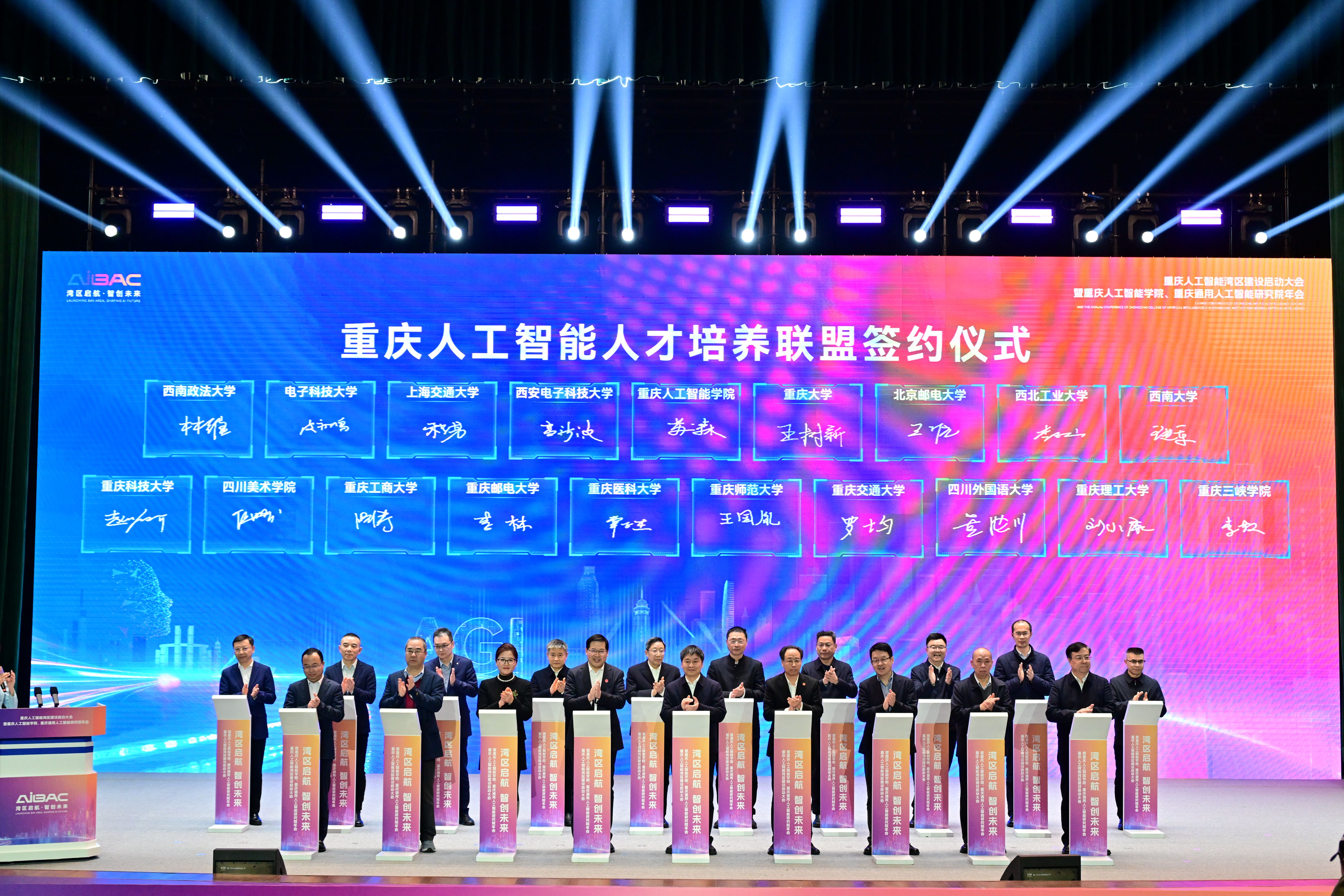 ▲2026年1月10日,南岸区重庆人工智能学院,“湾区启航·智创未来”重庆人工智能湾区启动大会暨重庆人工智能学院、重庆通用人工智能研究院年会在此启幕。记者 齐岚森 特约摄影 郭旭 摄 “成长为通识、通智、通用兼备的新时代AI青年!” 1月10日,位于南岸区的重庆人工智能学院报告厅内声浪澎湃。来自重庆大学、西南大学、重庆邮电大学等高校数十名学生代表,与全球首个通用智能体“通通”及其智能机器人伙伴,共同发出《智启新程·青创未来》的AI宣言。这不仅是青春的宣言,更是一座超大城市面向智能时代的昂扬宣示。 当天,“湾区启航·智创未来”重庆人工智能湾区启动大会暨重庆人工智能学院、重庆通用人工智能研究院年会启幕。这喻示着重庆将以“两院一湾”(重庆人工智能学院、重庆通用人工智能研究院、重庆人工智能湾区)系统性布局,构建“政产学研用金”一体化发展创新联合体,在加快打造全国人工智能应用高地的征途上迈出关键一步。 战略启航:一座超大城市的智能升维 会场内外,智能的气息无处不在。这不仅仅是一场年会,“加快打造人工智能应用高地”这一战略指引,在大会得到了全方位、体系化的呼应。其每一个环节,都紧扣“应用”与“生态”两个核心。 重庆人工智能学院一场颠覆性的人才培养变革正式亮相。“通识-通智-通用”培养体系,旨在造就引领产业发展、服务重庆应用高地建设的复合型领军人才。“我们的人才培育核心在于‘产教融合+区域适配’。”重庆人工智能学院常务副院长韩军伟指出,聚焦重庆“33618”现代制造业集群体系,学院旨在培养“理论能攻关、场景能落地”的实战型人才。为此,该学院创新实施学术、产业、学业的“三导师”制,首批产业导师均来自华为、长安、赛力斯等龙头企业及部分科研机构、独角兽企业。
