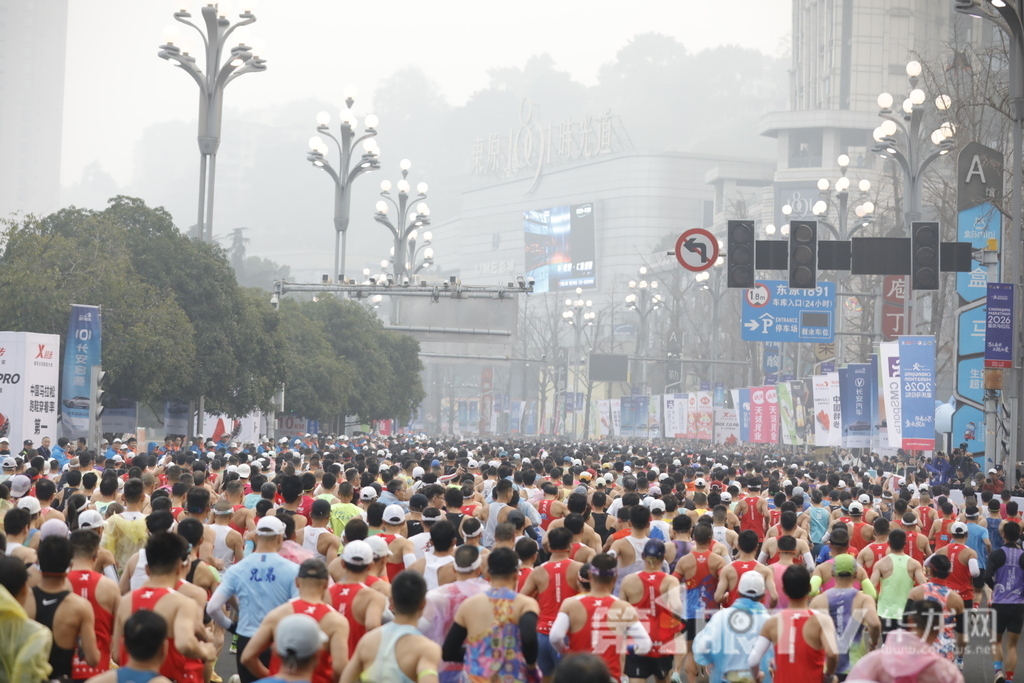 ▲跑友们奔跑在赛道上。第1眼TV-华龙网记者 李一鸣 摄 精英竞速,长江之滨上演巅峰对决 从3月提前到1月,这是有史以来举办时间最早的一届重马,但跑者们热情高涨。 在领先集团中,众多国内顶尖高手甫一出发便展现出凌厉的节奏。现身赛道的有丰配友、董国建、管油胜、岑万江、杨定宏等男子名将,丁常琴、李春霞、马秀针等女子高手…… 在他们身后,从朝气蓬勃的青年到78岁的长者,从本土跑者到占比高达84%的外地来客。今天,更有74名选手将在42.195公里的奔跑中,度过一个终生难忘的生日。
