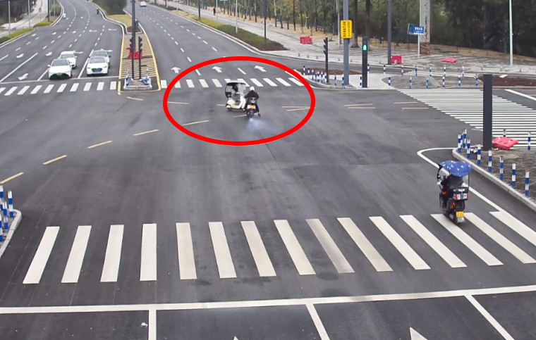 ▲事故现场截图 同样因“抢灯”前行发生事故的何某,面对交警询问时也懊悔地说:“当时看到路口没什么车,想着抢行几秒没关系,觉得自己行驶得不快,与对方还有距离。”2025年12月23日16时23分许,高新区学城大道与陈南路十字路口发生一起电动二轮摩托车违法闯灯转弯引发的交通事故,白色电动二轮摩托车驾驶人承担事故全部责任。经监控调查:何某驾驶白色电动二轮摩托车沿学城大道行驶至该路口时,为图一时方便,在左转信号灯红灯的情况下直接越过停止线强行转弯。此时,唐某驾驶黑色电动二轮摩托车绿灯正常直行,发现闯红灯的白色电动二轮摩托车距离过近,虽紧急制动仍未能完全避让,两车正面相撞。巨大的冲击力导致何某从电动二轮摩托车上摔倒,唐某也因惯性连人带车侧滑,双方均受轻微伤,车辆零部件散落一地,现场交通短暂受阻。