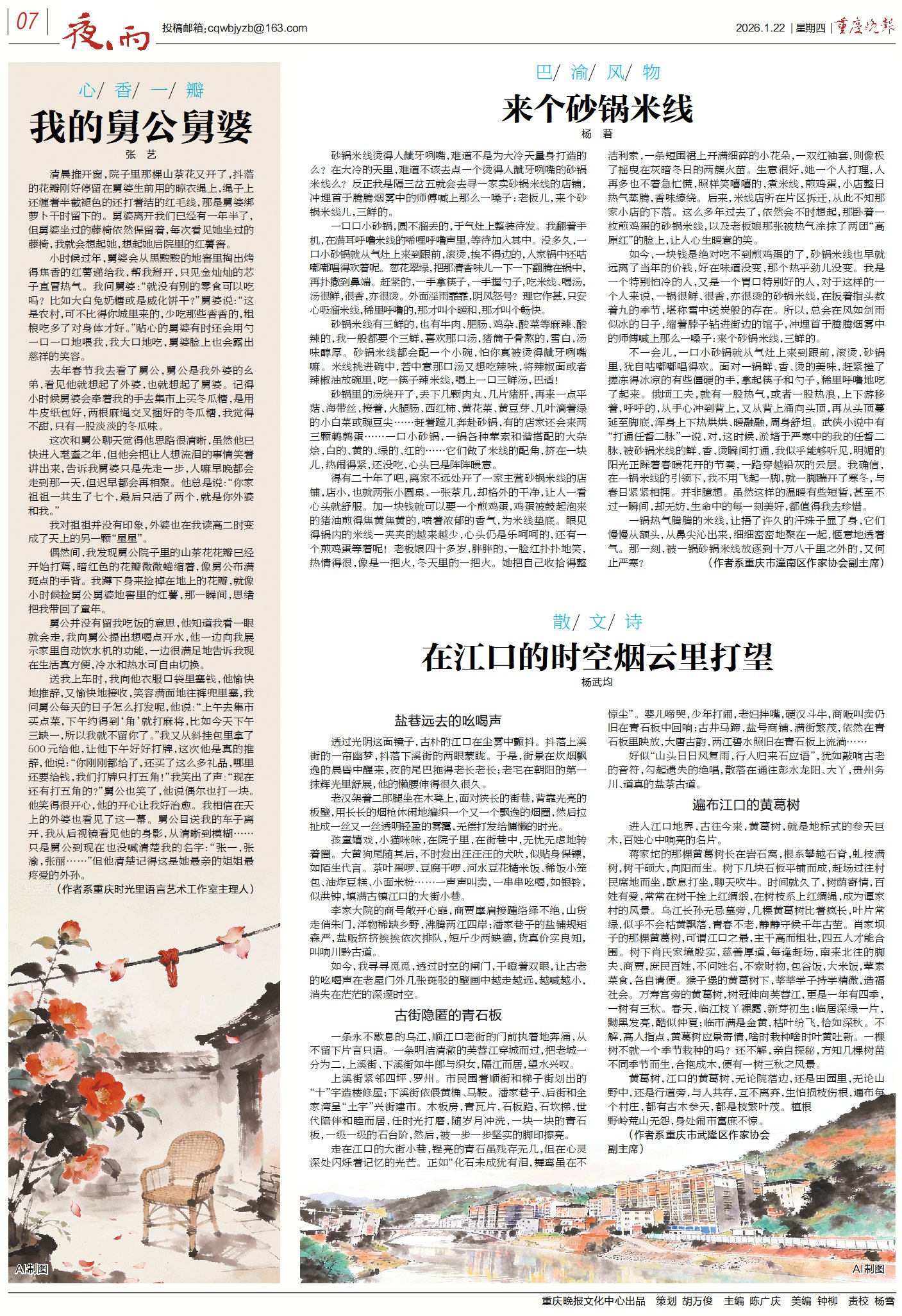 来个砂锅米线 文/杨莙 砂锅米线烫得人龇牙咧嘴,难道不是为大冷天量身打造的么?在大冷的天里,难道不该去点一个烫得人龇牙咧嘴的砂锅米线么?反正我是隔三岔五就会去寻一家卖砂锅米线的店铺,冲埋首于腾腾烟雾中的师傅喊上那么一嗓子:老板儿,来个砂锅米线儿,三鲜的。 一口口小砂锅,圆不溜丢的,于气灶上整装待发。我翻着手机,在满耳呼噜米线的唏哩呼噜声里,等待加入其中。没多久,一口小砂锅就从气灶上来到跟前,滚烫,挨不得边的,人家锅中还咕嘟嘟唱得欢着呢。葱花翠绿,把那清香味儿一下一下翻腾在锅中,再扑撒到鼻端。赶紧的,一手拿筷子,一手握勺子,吃米线、喝汤,汤很鲜,很香,亦很烫。外面淫雨霏霏,阴风怒号?理它作甚,只安心吸溜米线,稀里呼噜的,那才叫个暖和,那才叫个畅快。 砂锅米线有三鲜的,也有牛肉、肥肠、鸡杂、酸菜等麻辣、酸辣的,我一般都要个三鲜,喜欢那口汤,猪筒子骨熬的,雪白,汤味醇厚。砂锅米线都会配一个小碗,怕你真被烫得龇牙咧嘴嘛。米线挑进碗中,若中意那口汤又想吃辣味,将辣椒面或者辣椒油放碗里,吃一筷子辣米线,喝上一口三鲜汤,巴适! 砂锅里的汤烧开了,丢下几颗肉丸、几片猪肝,再来一点平菇、海带丝,接着,火腿肠、西红柿、黄花菜、黄豆芽、几叶滴着绿的小白菜或豌豆尖……赶着蹚儿奔赴砂锅,有的店家还会来两三颗鹌鹑蛋……一口小砂锅,一锅各种荤素和谐搭配的大杂烩,白的、黄的、绿的、红的……它们做了米线的配角,挤在一块儿,热闹得紧,还没吃,心头已是阵阵暖意。 得有二十年了吧,离家不远处开了一家主营砂锅米线的店铺,店小,也就两张小圆桌、一张茶几,却格外的干净,让人一看心头就舒服。加一块钱就可以要一个煎鸡蛋,鸡蛋被鼓起泡来的猪油煎得焦黄焦黄的,喷着浓郁的香气,为米线垫底。眼见得锅内的米线一夹夹的越来越少,心头仍是乐呵呵的,还有一个煎鸡蛋等着呢!老板娘四十多岁,胖胖的,一脸红扑扑地笑,热情得很,像是一把火,冬天里的一把火。她把自己收拾得整洁利索,一条短围裙上开满细碎的小花朵,一双红袖套,则像极了摇曳在灰暗冬日的两簇火苗。生意很好,她一个人打理,人再多也不着急忙慌,照样笑嘻嘻的,煮米线,煎鸡蛋,小店整日热气蒸腾,香味缭绕。后来,米线店所在片区拆迁,从此不知那家小店的下落。这么多年过去了,依然会不时想起,那卧着一枚煎鸡蛋的砂锅米线,以及老板娘那张被热气涂抹了两团“高原红”的脸上,让人心生暖意的笑。 如今,一块钱是绝对吃不到煎鸡蛋的了,砂锅米线也早就远离了当年的价钱,好在味道没变,那个热乎劲儿没变。我是一个特别怕冷的人,又是一个胃口特别好的人,对于这样的一个人来说,一锅很鲜、很香,亦很烫的砂锅米线,在扳着指头数着九的季节,堪称雪中送炭般的存在。所以,总会在风如剑雨似冰的日子,缩着脖子钻进街边的馆子,冲埋首于腾腾烟雾中的师傅喊上那么一嗓子:来个砂锅米线,三鲜的。 不一会儿,一口小砂锅就从气灶上来到跟前,滚烫,砂锅里,犹自咕嘟嘟唱得欢。面对一锅鲜、香、烫的美味,赶紧搓了搓冻得冰凉的有些僵硬的手,拿起筷子和勺子,稀里呼噜地吃了起来。俄顷工夫,就有一股热气,或者一股热浪,上下游移着,呼呼的,从手心冲到背上,又从背上涌向头顶,再从头顶蔓延至脚底,浑身上下热烘烘、暖融融,周身舒坦。武侠小说中有“打通任督二脉”一说,对,这时候,淤堵于严寒中的我的任督二脉,被砂锅米线的鲜、香、烫瞬间打通,我似乎能够听见,明媚的阳光正踩着春暖花开的节奏,一路穿越铅灰的云层。我确信,在一锅米线的引领下,我不用飞起一脚,就一脚踹开了寒冬,与春日紧紧相拥。并非臆想。虽然这样的温暖有些短暂,甚至不过一瞬间,却无妨,生命中的每一刻美好,都值得我去珍惜。 一锅热气腾腾的米线,让捂了许久的汗珠子显了身,它们慢慢从额头,从鼻尖沁出来,细细密密地聚在一起,惬意地透着气。那一刻,被一锅砂锅米线放逐到十万八千里之外的,又何止严寒? (作者系重庆市潼南区作家协会副主席) 网站编辑:杨雪 美编:钟柳 主编:陈广庆 策划:胡万俊 校审:罗再芳 总值班:杨飞 重庆晚报夜雨版面赏析