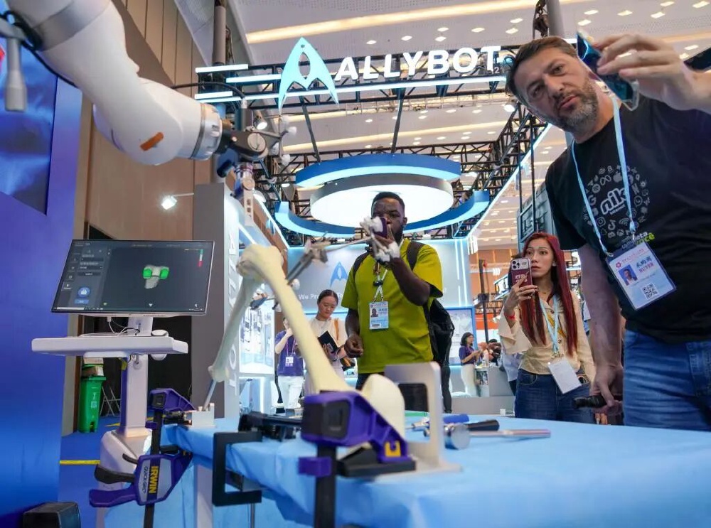 ▲2025年10月16日,采购商在第138届广交会元化智能科技(深圳)有限公司展台观看手术机器人产品。记者 肖恩楠 摄/新华社