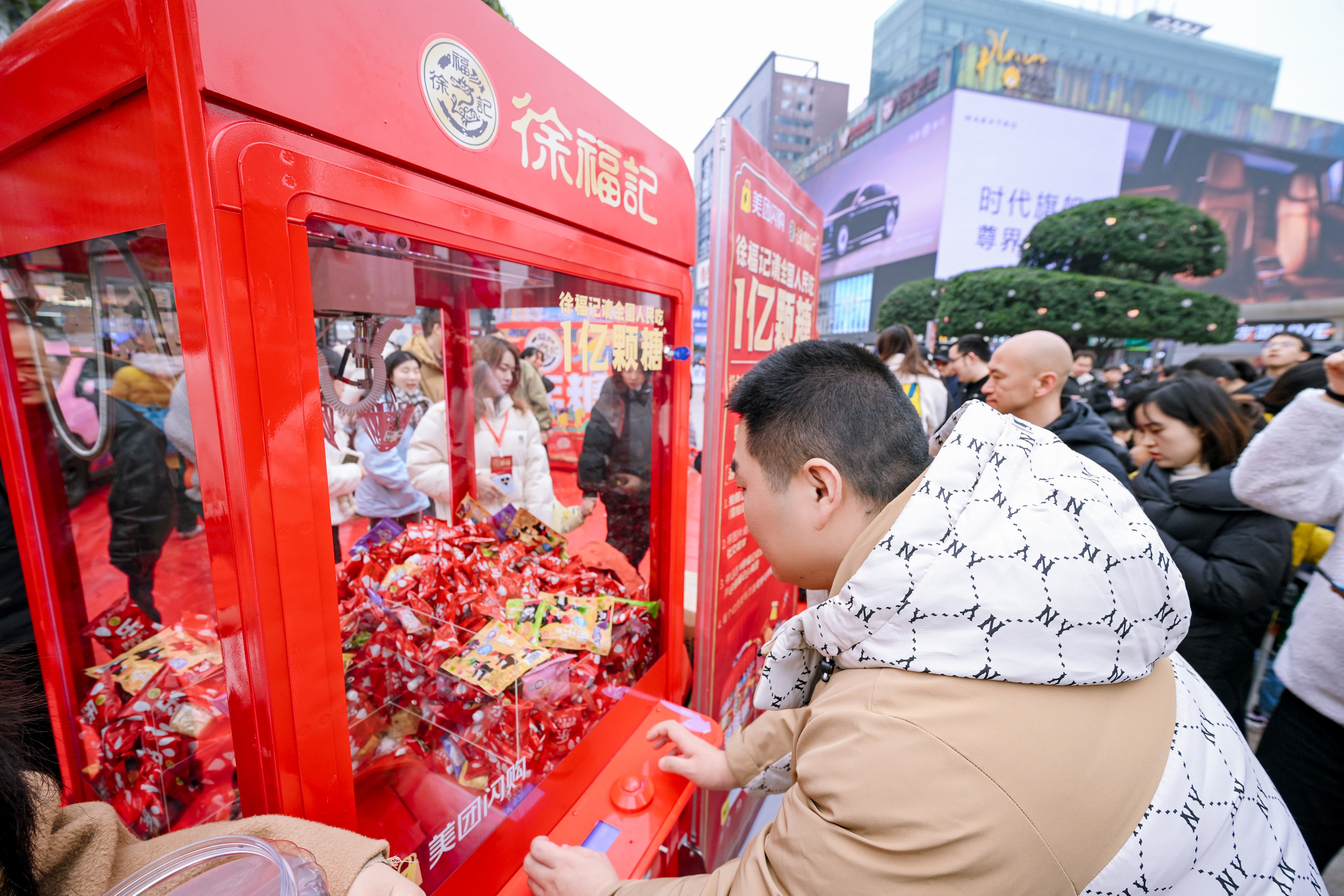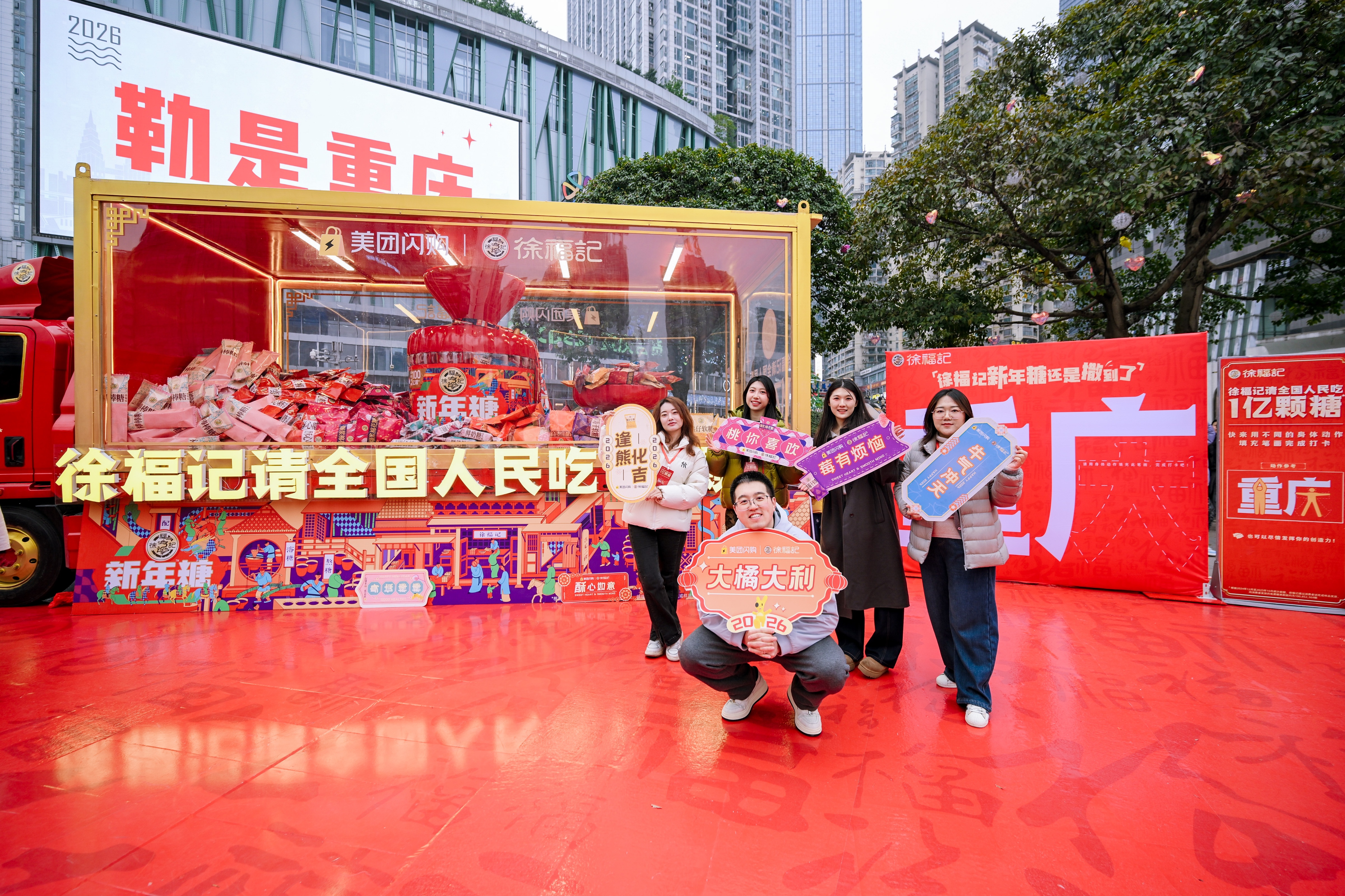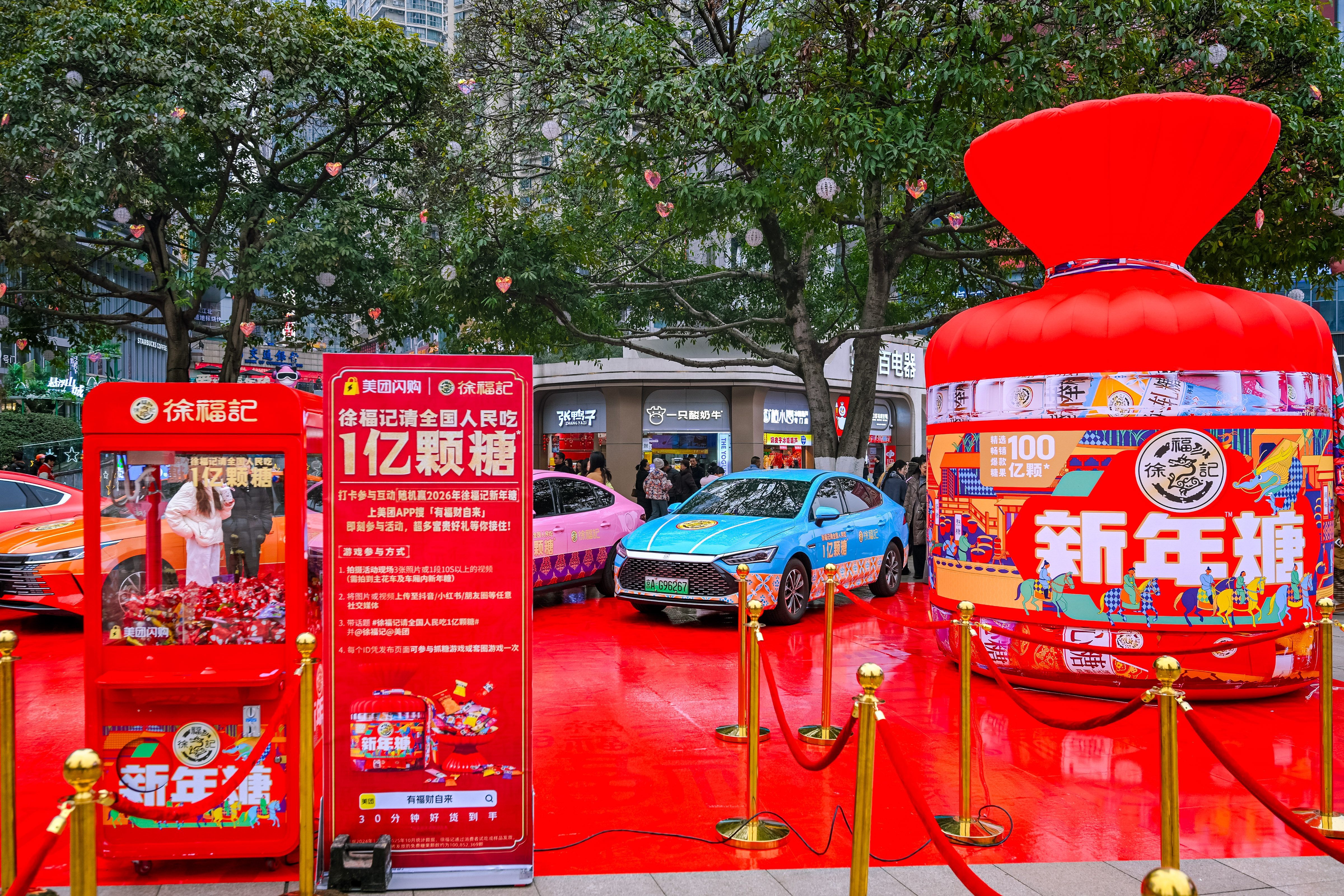 重庆观音桥步行街的人潮里,此起彼伏的快门声和欢呼声率先点燃了街头的热闹——路人们纷纷举起手机,对着停靠在路边的徐福记新年糖花车拍照打卡,有人凑到花车旁比出剪刀手,有人拉着同伴定格合影,还有人举着镜头向着花车的方向小跑,生怕错过这抹亮眼的年味。