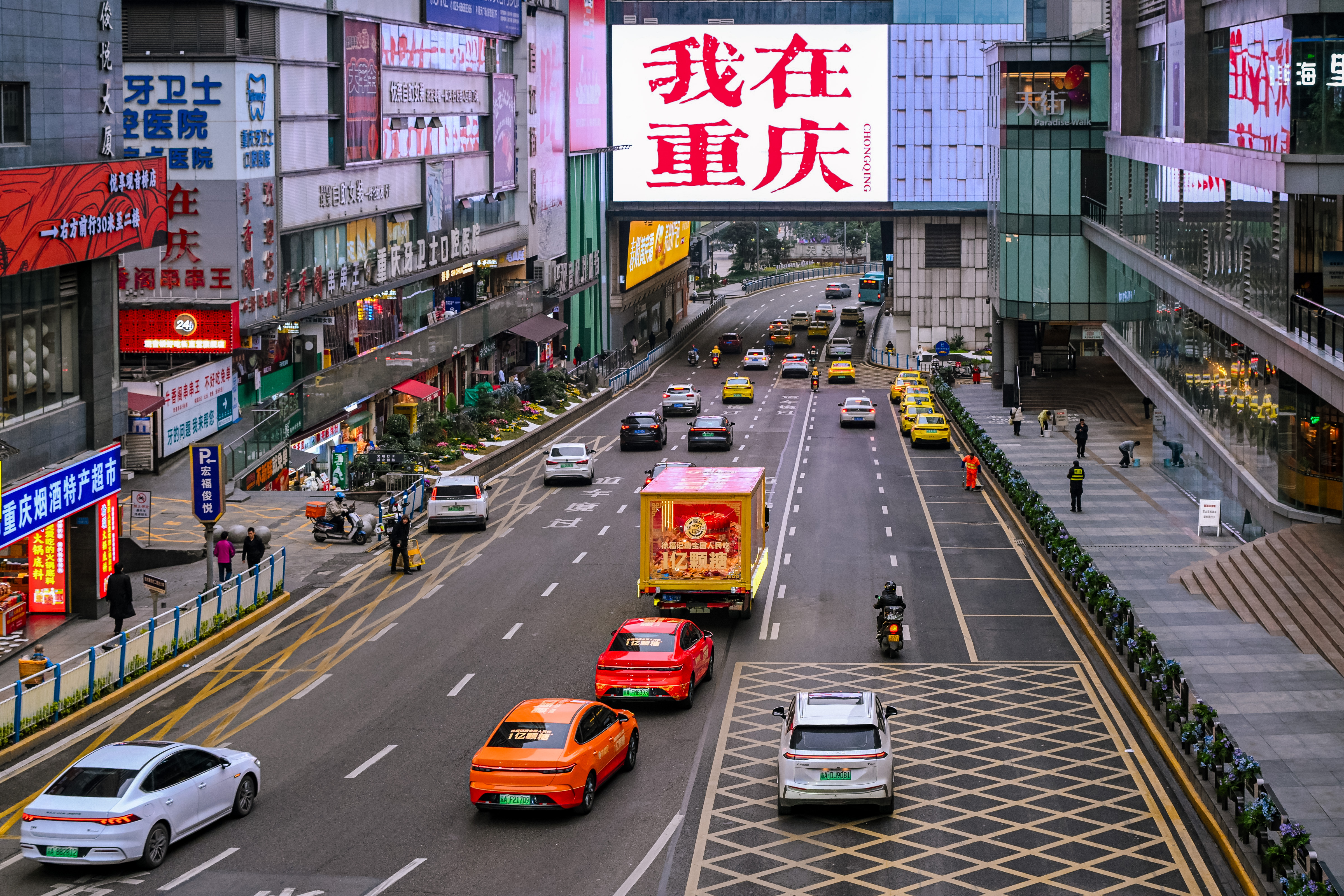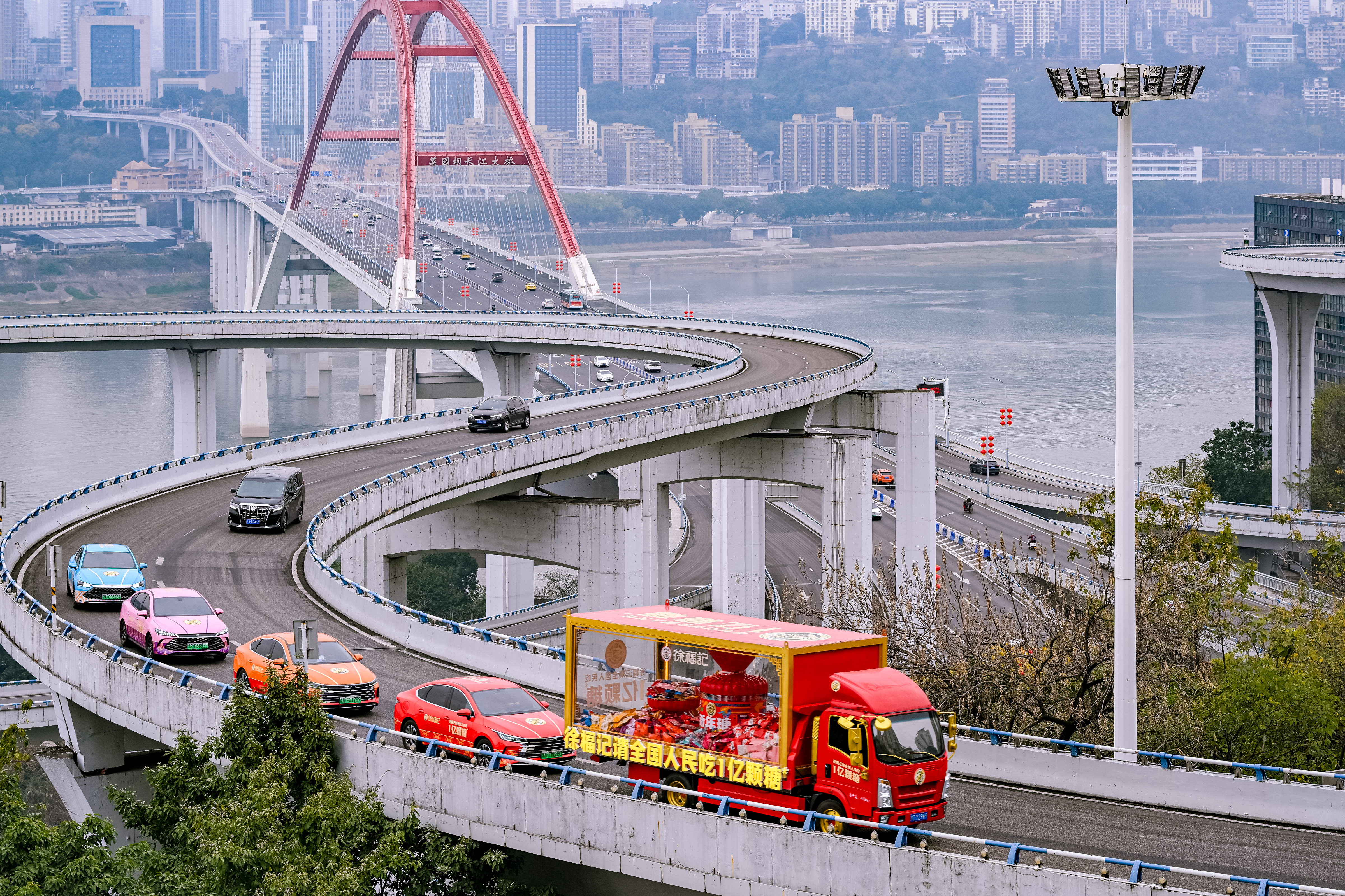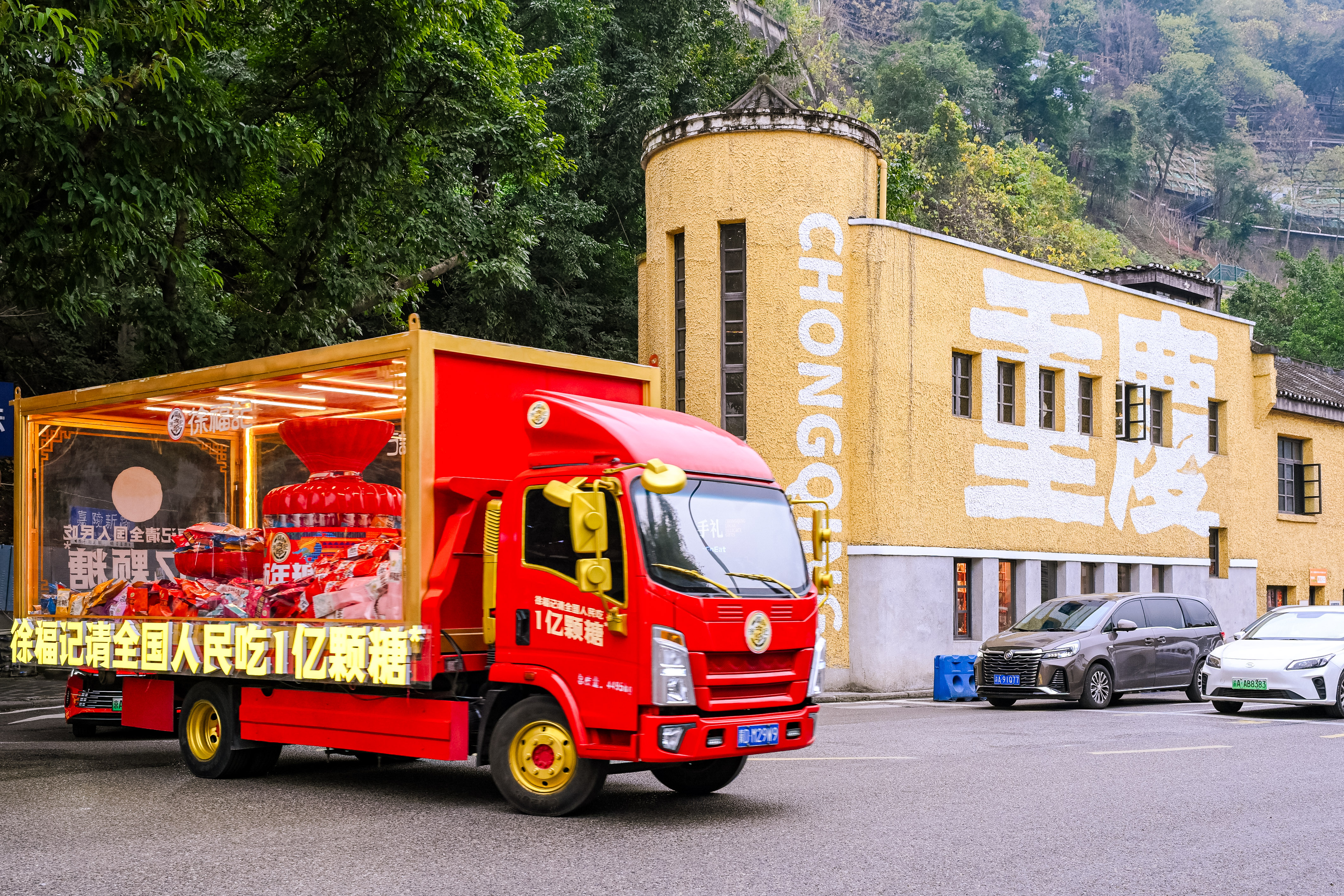 重庆观音桥步行街的人潮里,此起彼伏的快门声和欢呼声率先点燃了街头的热闹——路人们纷纷举起手机,对着停靠在路边的徐福记新年糖花车拍照打卡,有人凑到花车旁比出剪刀手,有人拉着同伴定格合影,还有人举着镜头向着花车的方向小跑,生怕错过这抹亮眼的年味。