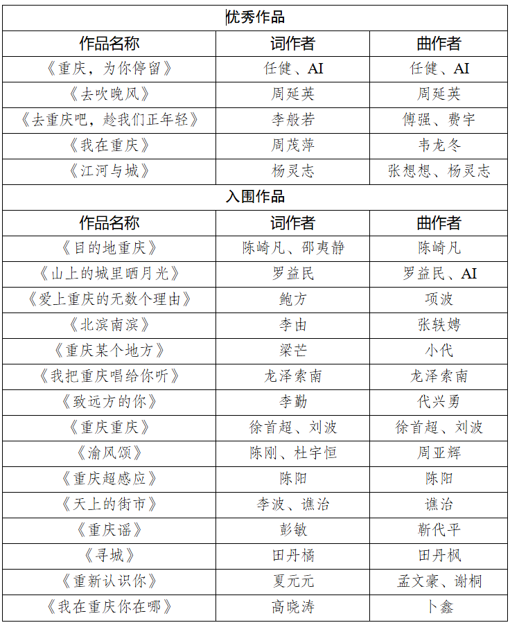“新韵重庆”歌曲创作大赛自2025年8月启动以来,吸引了全国各地广大音乐创作者踊跃投稿,近1400首作品参赛,最终评选出20首入围作品,其中,《重庆,为你停留》《去吹晚风》《去重庆吧,趁我们正年轻》《我在重庆》《江河与城》等5首作品脱颖而出,获评优秀作品。 在众多参赛者中,既有90高龄仍执笔抒怀的耄耋长者,也有18岁初试锋芒的青春学子;既有专业音乐人、词曲名家的倾力打造,也有来自农民、警察、教师、外卖小哥等各行各业的音乐爱好者真诚献唱。近1400首参赛作品主题鲜明,风格多样,或以宏大叙事描绘沧桑巨变,或用轻快民谣勾勒悠闲时光,或在浪漫旋律中谱写城市恋曲。部分作品巧妙融入AI协同创作,展现“科技+艺术”的创新实践,成为大赛一大特点。经过层层遴选、线上线下联动展播,涌现出一批旋律动人、感情真挚的好作品,展现了重庆向新创新、和谐高雅的城市气韵,唱响了“坚韧、忠勇、开放、争先”的重庆城市精神。 据悉,主办方后续将组织获奖作品进一步打磨提升,邀请知名音乐人参与歌曲制作,推出系列专题节目和音视频产品在线上广泛传播;还将举办“新韵重庆”歌曲创作大赛专场演唱会,在机场、火车站、轨道交通、商圈等线下场景播放相关作品,让这些动人旋律融入城市血脉,成为广泛传唱、共情共鸣的声音名片。 “新韵重庆”歌曲创作大赛优秀作品、入围作品名单 (排名不分先后)