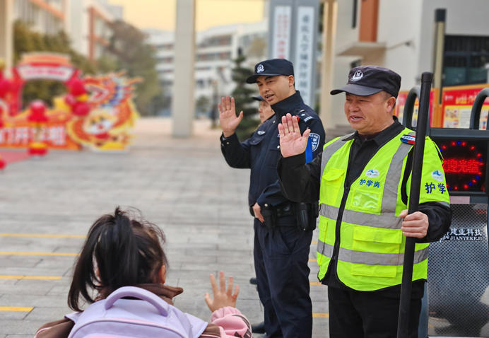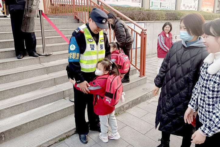 与孩子们互动 最后,香炉山派出所政委陈建表示,派出所将以此次联席会议为契机,牵头抓好三项重点工作:优化护学岗布局,动态调整警力部署,确保重点时段、重点路段警力全覆盖、无死角;深化联动协作机制,定期组织各方开展联合巡查、应急演练,畅通信息沟通渠道,实现问题隐患早发现、早处置;强化安全教育引导,联合学校、家长开展形式多样的安全宣传活动,全面提升学生自我保护能力。