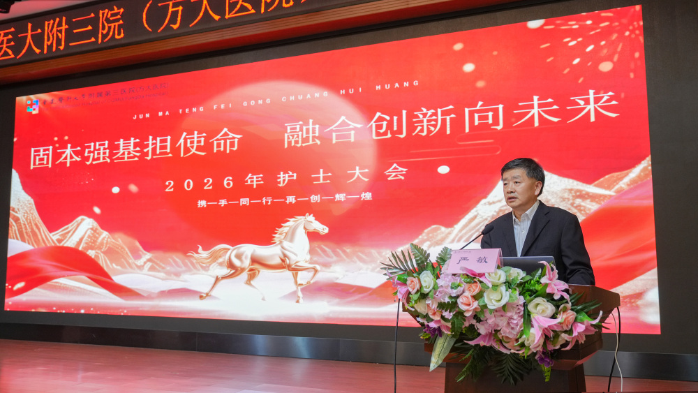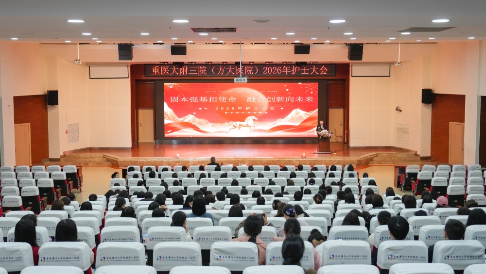 3月24日,重庆医科大学附属第三医院(方大医院)〔下简称:重医大附三院(方大医院)〕2026年护士大会在学术报告厅举行。大会以“固本强基担使命 融合创新向未来”为主题,深入贯彻2026年全国卫生健康工作会议精神,锚定“十五五”护理事业高质量发展方向,全面总结2025年重医大附三院(方大医院)护理工作,科学部署2026年任务,推动价值医疗理念与临床护理实践深度融合。院长傅仲学、党委书记李为兵出席会议并讲话,常务副院长严敏主持会议,全体护士长及护理代表参加会议。