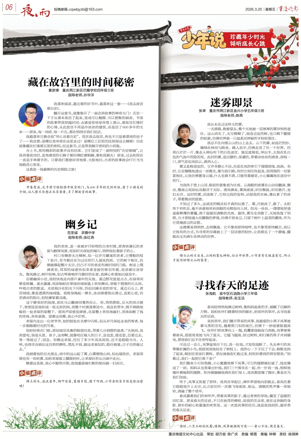 我从未见过这样大的雾。 一天清晨,推窗望去,整个天地被一层厚厚的雾帘悄然遮住。远山消失了,天空模糊了,就连近处的树,也只剩下朦胧的轮廓,仿佛世界被一只温柔而神秘的手轻轻笼住。 我忍不住向缙云山的山上走去。山下的雾,如迷茫的纱,缠绕在林间与路旁。踏入其中,仿佛走进了另一个世界。四周白茫茫一片,像走入了一座白色迷宫。能见度极低,伸出手,五指在乳白色的气流中若隐若现。此时的雾,是沉静的、深邃的,带着凉丝丝的清香,深吸一口,那气息似风似云,清冽入心。 雾又是极顽皮的。它并非静止不动,而是在风的牵引下缓缓摇曳、流淌。有时,它会慷慨地透出一丝微光,像为我引路;有时它却任性起来,把周围的一切紧紧抱住,让我仿佛置身云端,什么也看不清,只能凭着感觉,小心翼翼地在迷宫中前行。 当我终于登上山顶,眼前的景象更为壮观。云海般的浓雾在山谷间翻涌、飘动,整座山宛如仙岛般浮于天际。清风拂来,雾涛滚滚,时而聚拢,时而散开,变幻无穷。这时的雾,活泼极了,它掠过我的发梢,沾湿我的衣袖,像玩累了的孩子,带着微凉的湿意。 不知过了多久,这顽皮的精灵似乎真的玩倦了。雾,开始淡了,散了。太阳终于有机会,毫不吝啬地将利剑般的光辉投向人间。阳光一丝丝、一缕缕地穿透逐渐稀薄的雾霭,洒下温暖而清晰的光斑。最终,雾完全消散了,天地恢复了明朗,方才那场盛大而朦胧的梦境,仿佛不曾来过,只留下树叶上晶莹的露珠,作为它曾漫游过的证据。 这晨雾来得悄然,去得飘逸。它不像雨那样喧哗,也不像雪那样醒目,却以它独有的方式,为寻常的早晨披上了一层诗意的轻纱,让我看见了一个静谧、朦胧而又充满生命律动的世界。 【小编点评】 缙云山的日出美,山间的雾也神秘,似云中世界,小作者肯定极喜爱它,所以才能写好缙云山的雾景。 寻找春天的足迹 张海航 渝中区石油路小学三年级 指导教师:张玉洁