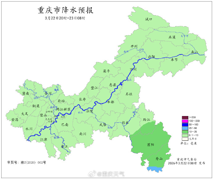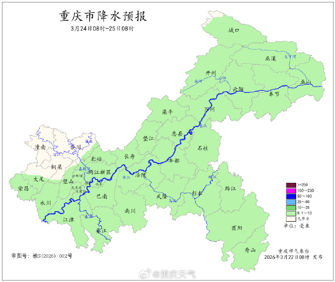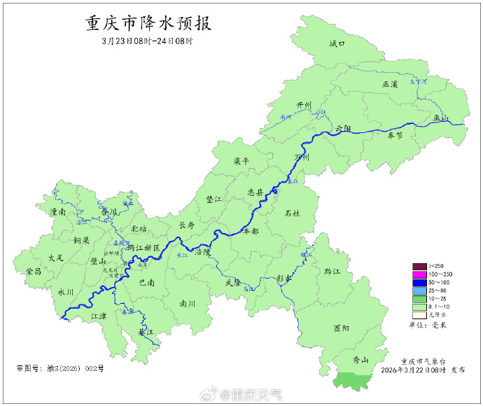 3月21日白天,重庆各地阴天间多云,最高气温普遍在12~23℃之间。重庆潼南、长寿、永川、沙坪坝等部分区县最高气温重新回到20℃以上,其中北碚最暖,最高气温达到了23℃。今天白天大部地区多云到阴天,夜间起大部地区迎降雨。 22日白天到夜间,各地多云到阴天转阵雨,东南部局地大雨(25~35mm),气温9~24℃;中心城区阴天间多云转阵雨,气温16~22℃。