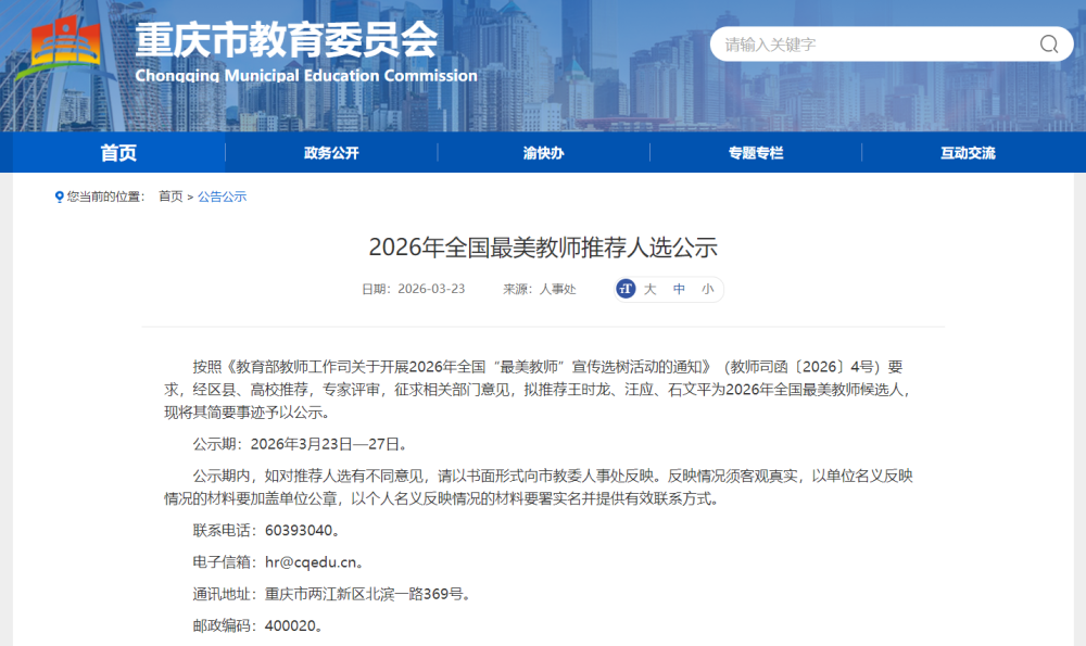 3月23日,记者从重庆市教育委员会获悉,按照《教育部教师工作司关于开展2026年全国“最美教师”宣传选树活动的通知》要求,经区县、高校推荐,专家评审,征求相关部门意见,拟推荐王时龙、汪应、石文平为2026年全国最美教师候选人。