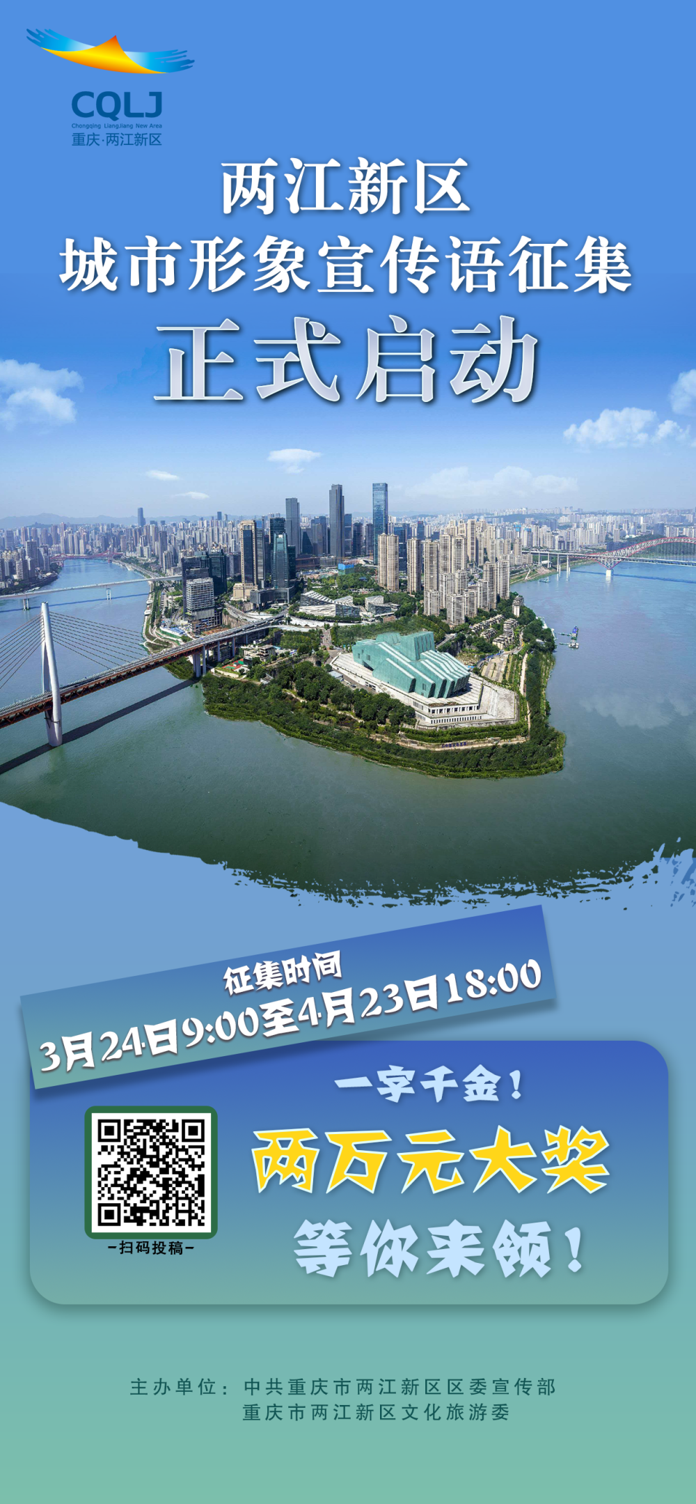 大区大担当,新区新作为!重庆市两江新区发出诗意邀约——邀你用一句话,定义这座“两江澎湃、四山叠翠”的现代化人民城市。 新起点呼唤新表达 2025年,国务院正式批复同意设立两江新区行政区,赋予两江新区在国家发展全局、重庆发展大局中的新使命、新定位,成为全国第三个、内陆第一个设立为行政区的国家级新区。 这里,是国家战略的叠加之地——新时代西部大开发、成渝地区双城经济圈、长江经济带、西部陆海新通道等重大战略在此交汇; 这里,是产业创新的澎湃之地——4000亿级智能网联新能源汽车集群、3000亿级电子信息产业、2000亿级软件信息服务业拔节生长,智能制造、金融、商贸等多个千亿级、百亿级先进制造业和现代服务业集群蓄势赋能,新质生产力加速起势; 这里,是链接全球的开放之地——全国唯一“水港+空港”综保区、西部唯一港口型国家物流枢纽果园港,让两江通达全球127个国家和地区; 这里,更是宜居宜业的诗意之地——长江与嘉陵江“两江”环抱,中梁山、铜锣山、明月山、龙王洞山“四山”簇拥,124公里滨江岸线、385个公园一步一景,尽享一半山水一半城,一半烟火一半诗意。 “站在新的历史起点上,我们迫切需要一句既能承载两江厚重底蕴、又能传递两江时代使命,既能‘写在纸上’、又能‘刻在心里’的城市形象宣传语,充分展现两江气魄、两江温度,凝聚社会共识。”活动主办方负责人表示。 应征作品需满足以下要求 今日,由中共重庆市两江新区区委宣传部、重庆市两江新区文化旅游委联合主办的“两江新区城市形象宣传语征集宣传活动”正式启动。 据悉,本次活动面向全社会征集。应征作品需满足以下要求: 凸显新区特质——立足两江新区作为国家级开发开放新区的战略定位,展现其作为重庆经济发展主战场、开放主门户、创新主阵地的独特气质; 彰显城市品位——生动呈现“两江环抱、四山簇拥、百园叠翠”的生态格局,传递宜居宜业宜游宜学宜养的高品质生活新典范形象; 展现人文底蕴——体现巴渝文脉绵延、历史人文荟萃的深厚积淀,彰显新时代两江人文精神; 语言通俗好记——每条宣传语控制在20字以内,需附200字以内的创意说明,要求精炼简洁、有高度有温度、易于传播引发共鸣。 奖项设置 设一等奖作品1件,奖金20000元;二等奖作品5件,每件奖金5000元;三等奖作品10件,每件奖金1000元。(以上奖金均为税前)。 组织评选 作品征集结束后,将通过网络展示互动和专家综合评审等方式,评出获奖作品。 征集方式 此次活动通过新重庆客户端进行征集。详情请关注新重庆客户端“两江新区城市形象宣传语征集”专题,按照提示上传作品即可。 征集时间 3月24日9点至4月23日18点。 征集结束后将进入展示互动、专家评审,最终结果将于5月下旬公布。 两江新区,等你定义!