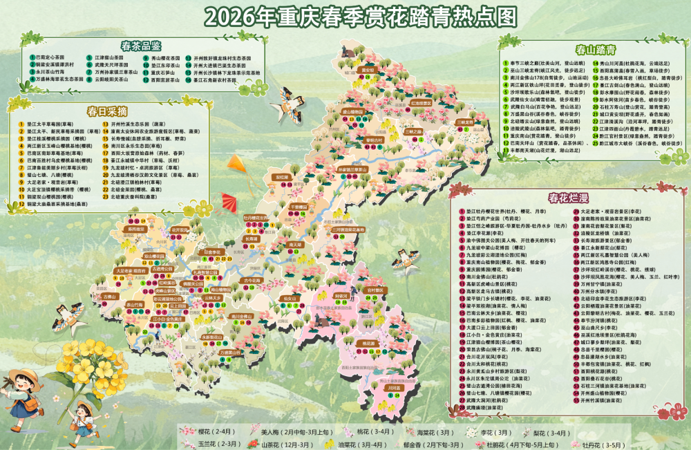 ▲2026重庆春季踏青赏花地图。受访者供图 3月26日,2026年重庆春季优质旅游资源推介活动暨2026年垫江牡丹文化节开幕。现场发布2026重庆春季踏青赏花地图,全景收录全市119处春日打卡点位,将赏花、采茶、徒步、采摘等春日乐趣一图尽览。 这119处春日打卡点地图包含了55处赏花地点、16处特色茶园、25处踏春徒步胜地,汇集了23个春日采摘基地,覆盖全市30多个区县,赏花踏青时间将持续整个春季。 在此基础上,主办方还全新推出重庆十大春季旅游精品线路,分为繁花似锦、春茶品鉴、春山踏青、田园拾趣、暖泉沐春等主题,串联起“雄奇山水 新韵重庆”的灵秀风光、人文底蕴与田园烟火,游客们顺着线路图就可一站式游览重庆春天的所有美好。