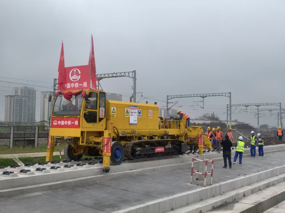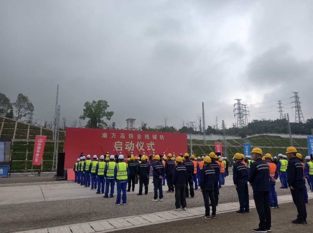 4月3日8时58分,在涪陵区涪陵北站施工现场,首对500米长钢轨从新型多功能长钢轨牵引车上稳稳铺下,标志着新建重庆至万州高速铁路(以下简称渝万高铁)全线铺轨工程正式启动。