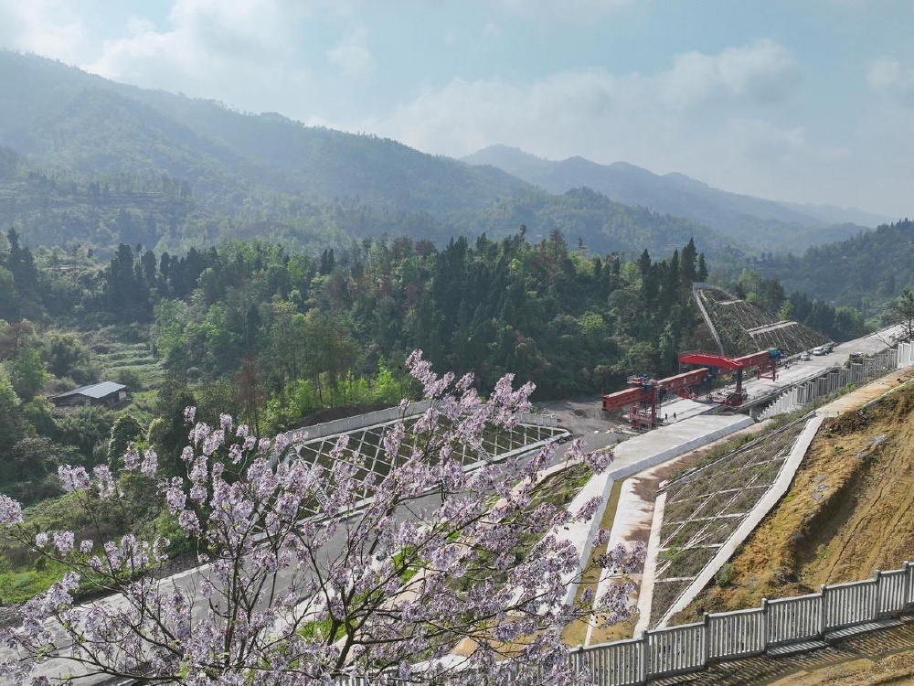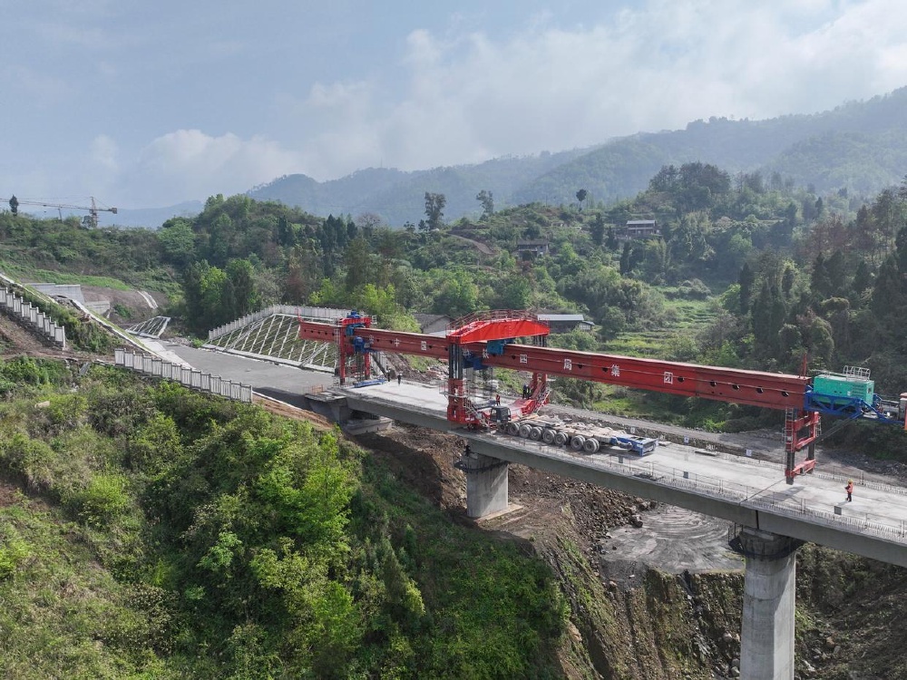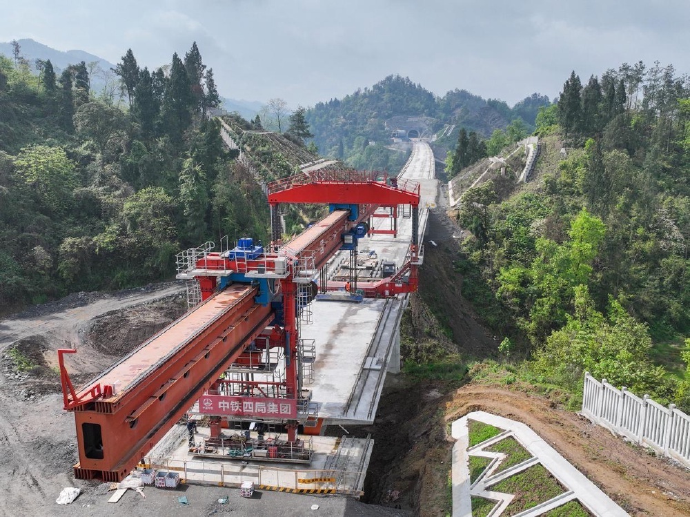 ▲4月3日在四川省达州市拍摄的西渝高铁康渝段槽沟中桥架梁作业现场(无人机照片)。新华社记者 王曦 摄