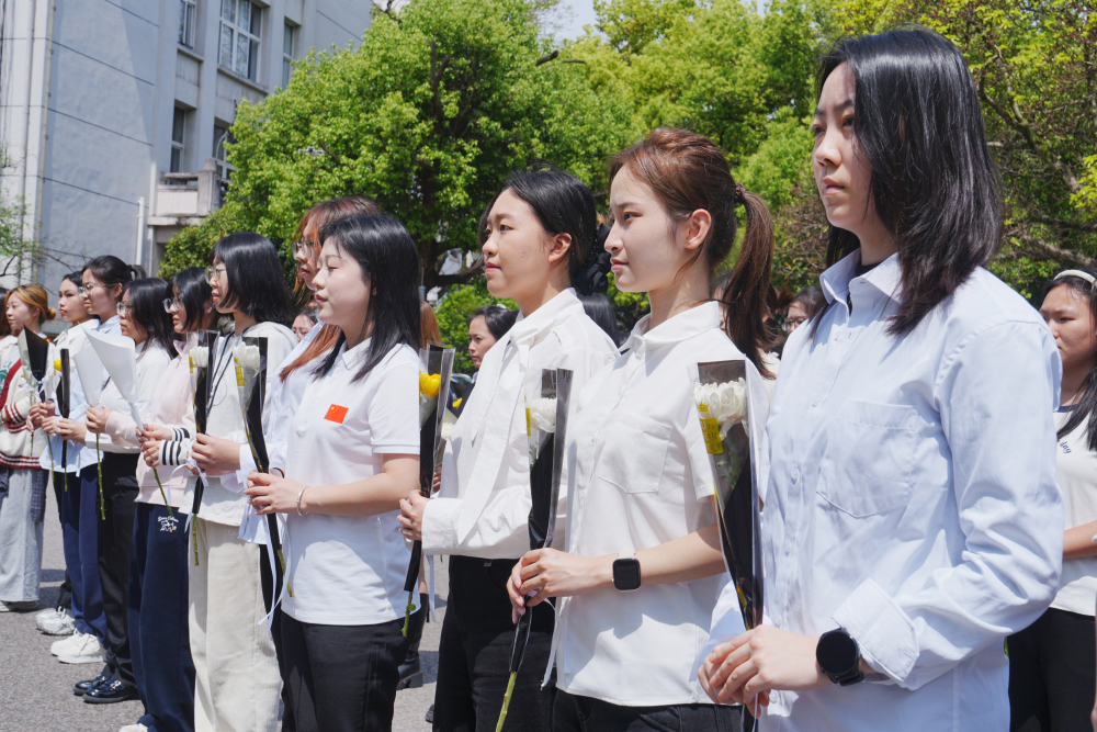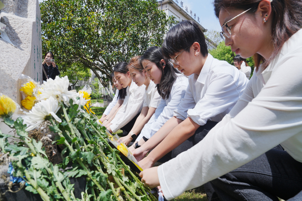 ▲4月3日,西南大学校内的袁隆平塑像前,该校校史宣讲团的讲解员和化学化工学院的研究生们一道追思世界杂交水稻之父袁隆平院士。特约摄影 秦廷富