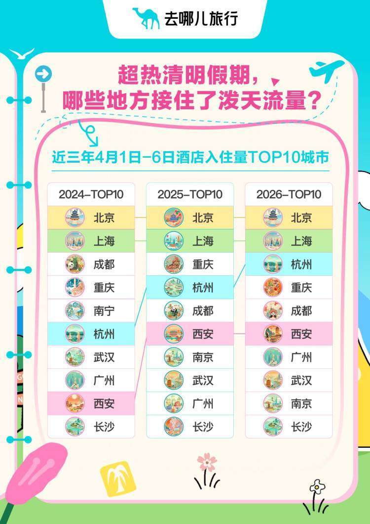 去哪儿旅行数据显示,重庆上榜最近三年4月1-6日酒店入住量城市TOP10。 去哪儿旅行的数据同时显示,从酒店入住热门城市来看,旅游资源丰富的大城市,以及适合踏春的江南水乡,都是顶流。2026年4月1日-6日,清明假期酒店预订量最高的Top10城市为:北京、杭州、上海、西安、重庆、武汉、南京、广州、成都、长沙。 去哪儿旅行数据中还有一项特别亮眼,全国酒店预订量增速TOP20小城中,有四分之三来自川渝地区。比如有三峡景观的重庆巫山、奉节酒店入住量增加了2倍。 重庆的魅力当然不止于此。上游新闻记者发现,在去哪儿旅行还发布了2024年到2026年连续三年4月1日-6日(清明节假期)酒店入住量的TOP10城市,重庆三年均榜上有名。 而同程旅行除了发布的《2026春假及清明假期旅游总结报告》(下称《报告》),同时还专门发布了今年清明假期和春假叠加后对重庆文旅市场的观察。 报告显示,整个假期中,传统乡村游、赏花游、登山游等春季主题依然最受追捧,亲近自然的露营体验与沉浸式的汉服旅拍也备受青睐,相关产品预订热度环比上涨230%。同时,一场以家庭为单位、以知识收获为核心的“学习型旅行”浪潮,在这个春天清晰涌现。 具体来看,春假及清明期间,国内热门目的地城市包括:上海、杭州、成都、南京、北京、深圳、广州、苏州、重庆、西安。酒店预订热度增幅最高的目的地包括:贵州、云南、四川、江苏、重庆、安徽、西藏、新疆、海南、浙江,这些地区也多为春假政策覆盖区域。《报告》提到,这些城市具有的共同特点值得留意,即大多是拥有顶级博物馆、科技馆或超级IP的“知识富矿”型城市。