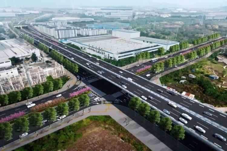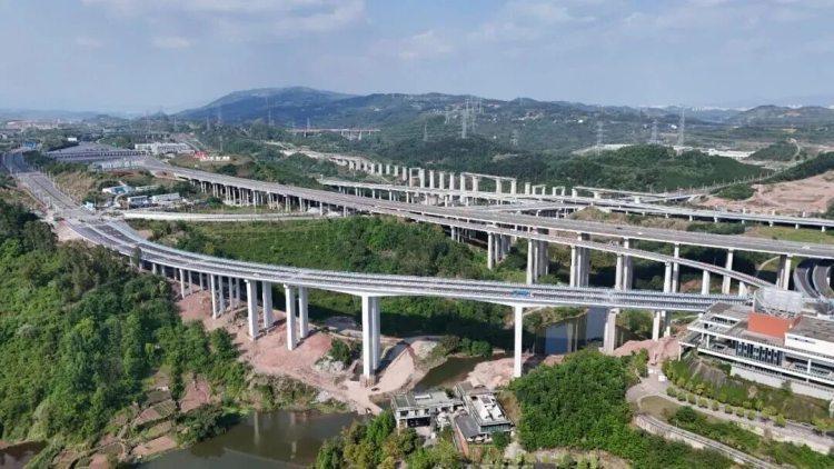 嘉运立交效果图。重庆市住房城乡建委供图 宝山大桥西延伸段开工建设 近日,快速路五联络线宝山大桥西延伸段(渝武高速至江家坪立交)正式开工建设,工程整体计划于2029年下半年完工。该项目建成投用后,将为蔡家片区新增一条东西向快速通道。 该项目道路全长约3.6千米,主线双向6车道,设计速度80千米每小时,道路等级为城市快速路,主要建设内容包括3座立交(周家院立交、嘉运立交、1号简易立交)、长隧道1座(同兴隧道,长1031.54米),主线高架桥2座、主线地下通道1座。 该项目西侧起点接蔡家隧道,向东与渝武高速、渝武高速扩能工程相交形成周家院立交,以隧道形式穿过同兴工业园,终点与江家坪立交顺接。 该项目是快速路五联络线的重要组成部分,建成投用后将有效串联蔡家、悦来与中央公园片区等区域,显著改善区域交通条件。
