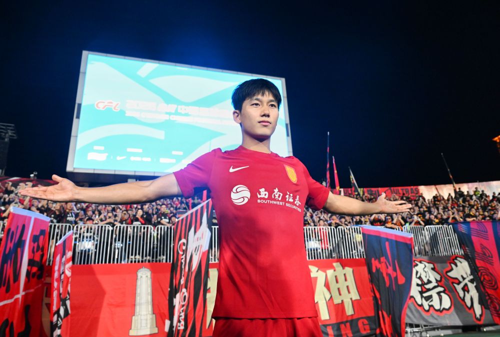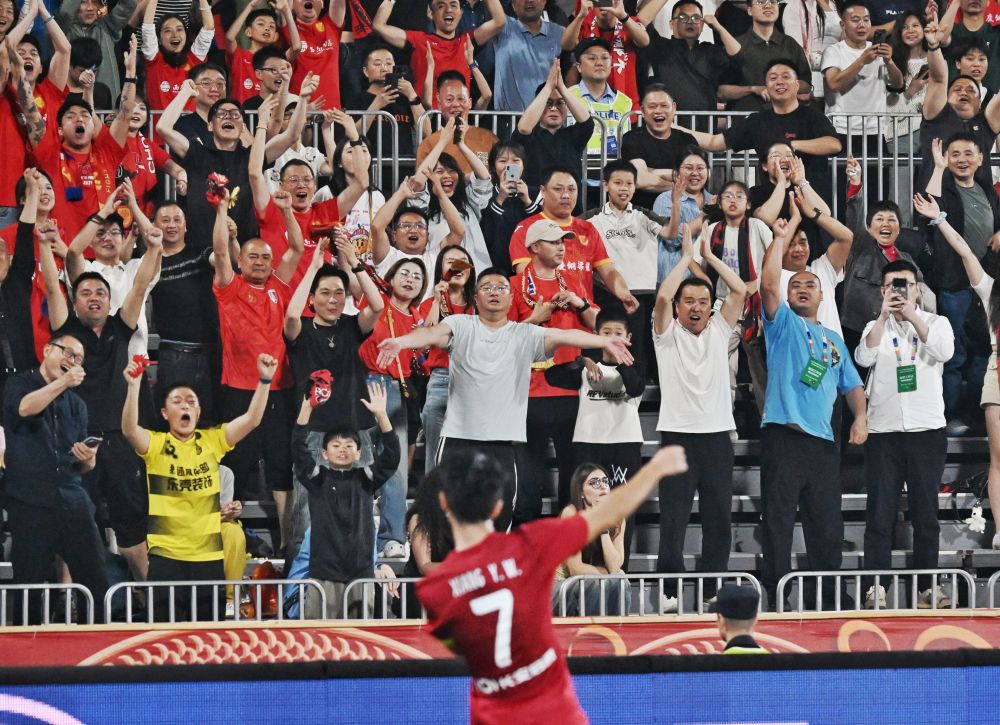 ▲4月17日晚上,重庆铜梁龙在主场以2:0的比分击败了深圳新鹏城。图为重庆铜梁龙队长向余望和球迷庆祝进球。首席记者 龙帆 摄 “队长,队长,英勇的向余望!”主场取胜后,现场1.8万名球迷齐唱《队长之歌》,庆祝向余望斩获中超首球。赛后,向余望被评为全场最佳球员。他在场边接受采访时表示:“我个人刚刚伤愈复出,竞技状态还没有达到最佳,能够取得进球有一定的运气成分。非常感谢整个团队的全力支撑,感谢医疗团队,也感谢教练组给予我的充分信任。”对于球队接下来40天9场比赛的魔鬼赛程,向余望表示球队会全力以赴:“魔鬼赛程确实有难度,我们走一步看一步吧,球队始终会保持全力以赴的拼搏态度,把自己放在挑战者的姿态上,认真对待每一场比赛。”
