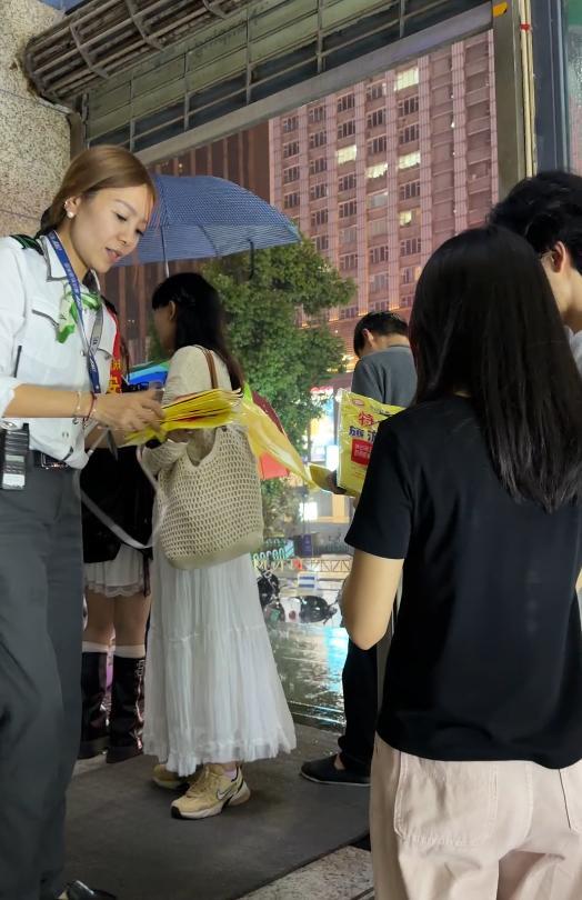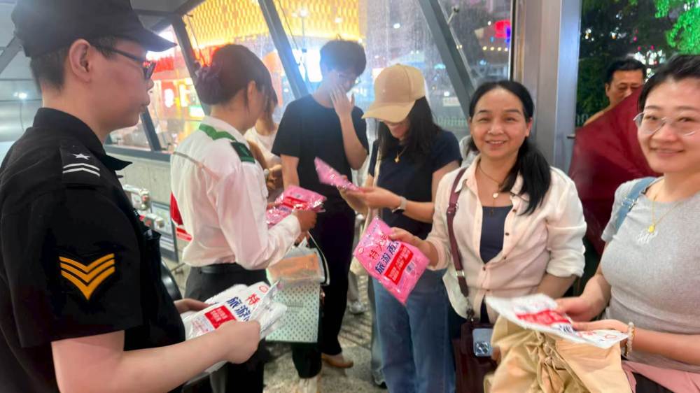 轨道交通工作人员为乘客发放一次性雨衣。 重庆中心城区降雨后,重庆轨道交通各车站快速行动,南坪站、工贸站、翠云站、嘉州路站、重庆北站南广场站、观音桥站、曹家湾站、新山村站等多个车站,同步为乘客送上一次性雨衣。3号线九公里站还特意为乘客准备了爱心公益雨伞,供有需要的乘客应急使用,让雨夜出行的乘客倍感温暖。