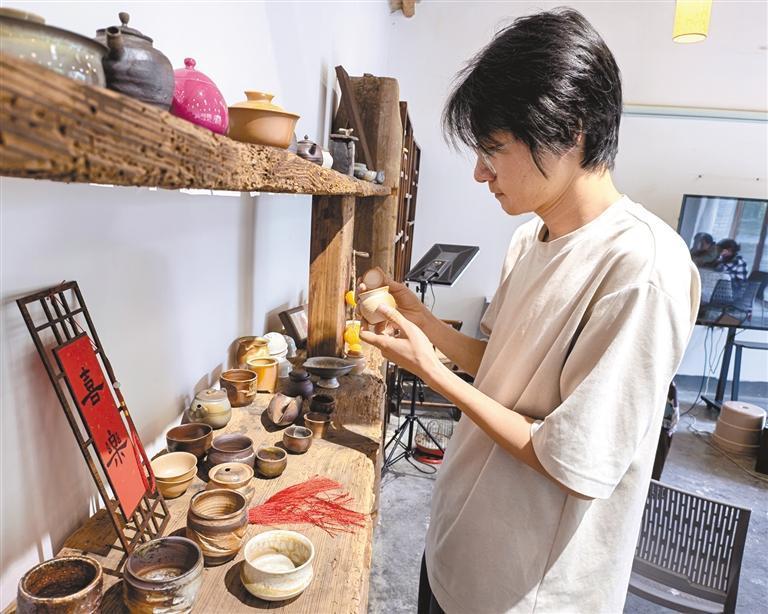 王彬毓 走进“三陶主义阿树小院”,一座柴窑内的炉火正发出噼啪声。今年33岁的山西青年王彬毓俯身观察窑内火色,满心期待着新一批陶瓷烧制出炉。 对于王彬毓来说,虎头村是他追梦的地方。在2022年以前,王彬毓还在景德镇做陶,那时他便想找个村子建柴窑。“陶瓷烧制分电窑、气窑、柴窑,电窑最稳定但缺少变化,气窑是行业主流,而柴窑最古老、最难控制、也最有创作魅力,这是我在城市里很难实现的追求,也是我扎根这里的重要理由。”王彬毓说,2022年,他在网上搜“全国文明村”,跑了很多地方,最终才落脚虎头村。 “一过来,村里就帮我找场地、协调和房东洽谈,让我感觉到很踏实。”初到虎头村,王彬毓就感受到超出预期的温暖。 扎根虎头村后,王彬毓安心做陶,还将书法与陶瓷结合,在器皿上题字题诗,做文化体验活动。这种传统又新颖的模式,很快积累了口碑。 2025年,王彬毓的陶艺工作室渐入佳境,原“稻野农场”负责人找到他,邀请他接手打理农场。“陶艺能吸引游客过来,大家除了做陶,还能在农场体验田园生活,刚好互补。”王彬毓当即答应下来。 接手农场后,王彬毓为农场取名“老虎先生的农场”,还为游客设计了一全套的体验项目:既有陶艺、手工面包窑,又有水果采摘、动物投喂,还有民宿、露营。 “来村里的这几年,我成长了不少。”王彬毓坦言,从前他是只懂做陶的手艺人,现在要管运营、做推广、做接待,这些都让他更成熟、更接地气。村委和街道也经常帮他推广、对接客源,这让他充满归属感。 王彬毓的租约还有十年,他说:“未来我想安心做陶、认真经营,把接地气的乡村体验做得更好,也希望更多像我一样的人知道虎头村、来到虎头村。” 02 村里不只是谋生地 更是青春的大舞台