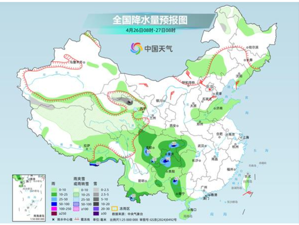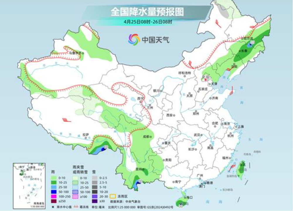 本周末(4月25日至26日)南方将迎来降水间歇,大部地区气温快速上升;明天夜间起,新一轮降水来袭,南方气温也会随之回落。在北方大部,未来几天降水不多,气温波动较小,但东北地区有明显降水降温,需注意防范。 周末大部降水较少 明天夜间起新一轮降水来袭 昨天,南方降水进一步向南缩减,江南大部降水停歇,但广东、海南等地仍有明显降雨;同时,昨天东北地区和内蒙古东北部雨雪有所增多,监测显示,昨日8时至今日6时,四川南部、云南东部、广东南部、海南岛等地部分地区出现大到暴雨,海南岛东北部及云南昆明、广东茂名局地大暴雨,海南海口、文昌局地特大暴雨;上述地区最大小时降雨量30至60毫米,海南岛局地70至117毫米;山西南部、河南西部、四川南部、云南中东部等局地出现雷暴大风,云南局地出现冰雹;内蒙古东北部、黑龙江西北部等地部分地区出现降雪或雨夹雪天气,局地出现中到大雪。 今天,随着广东等地降水将停歇,周末南方大部将迎来降水间歇期,普遍以晴好天气为主。不过明天夜间起,南方将迎来新一轮降雨,预计一直到29日,西南地区东部、江汉、江南、华南等地部分地区将自西向东出现大到暴雨,局地大暴雨,并伴有短时强降水、雷暴大风或冰雹等强对流天气。 在东北地区和内蒙古东部,未来三天仍多雨雪天气,其中黑龙江和内蒙古东北部会出现降雪;在北方其余大部地区,未来三天降水总体不多。 具体来看,中央气象台预计,今天,内蒙古东北部、黑龙江西北部、西藏北部、青海西南部等地部分地区有小雪或雨夹雪;黑龙江东部、吉林中部、辽宁北部、西藏东南部、云南南部、海南岛、台湾岛等地部分地区有中到大雨,其中,西藏东南部、云南南部等地局地有暴雨。