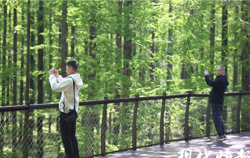 黄海森林,现实版“绿野仙踪” “森”呼吸,“林”距离。当天上午,一行人抵达东台黄海森林生态旅游度假区,乘坐观光车一路向前,风在耳边呼啸,路两侧的二月兰如云霞铺地,清新的空气让人忍不住打开窗户,来一口深呼吸。 “大家请看,今天显示黄海森林的负氧离子含量为5449/cm³。”讲解员介绍,清新空气的负氧离子标准浓度为每立方厘米1000—1500个,黄海森林的负氧离子含量常年在5000以上。