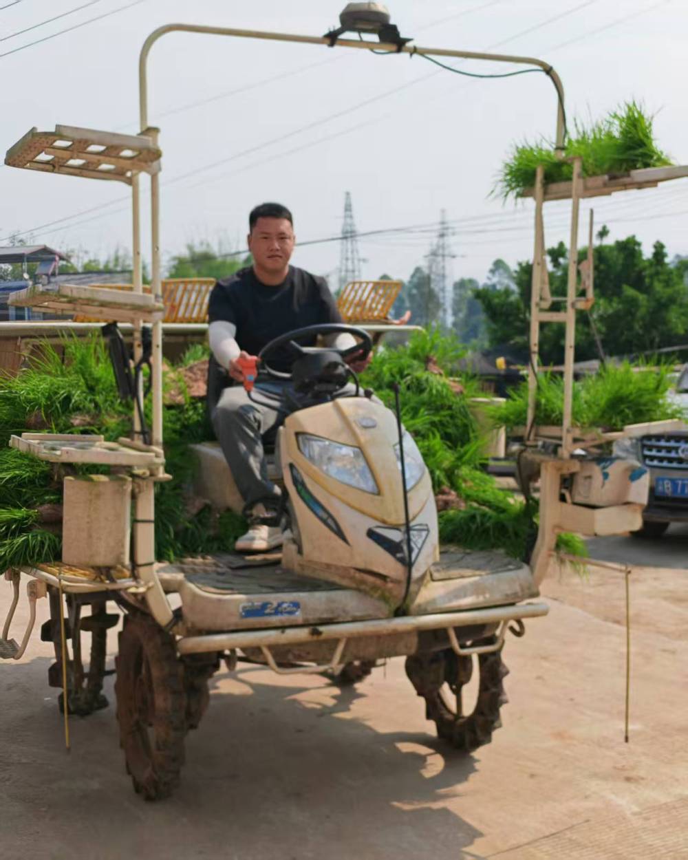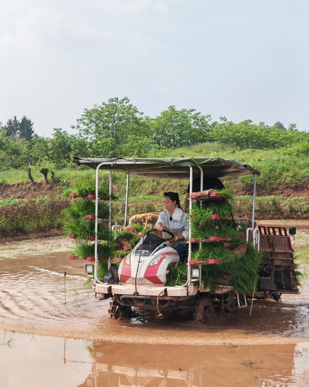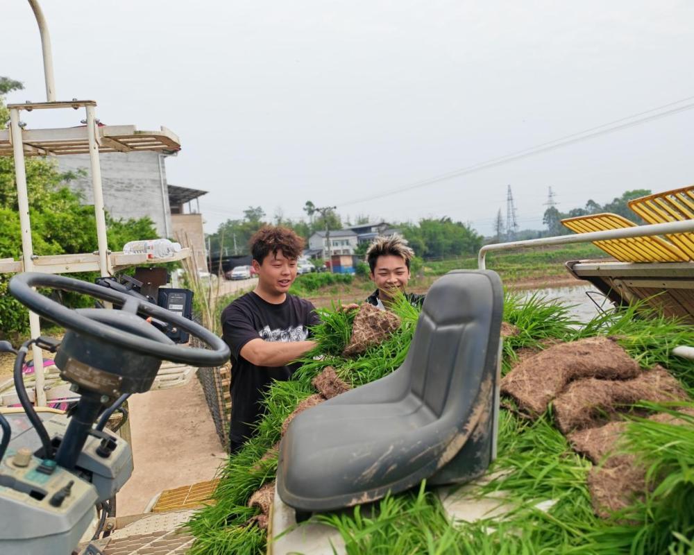 晴空万里,暖阳倾洒在铜梁区福果镇高山村的连片水田上,田间机器轰鸣声此起彼伏。采访当天,4台插秧机正在水田里来回穿梭,一排排嫩绿的秧苗整齐有序地扎根土壤,短短半小时,3亩多水田便完成插秧。 驾驶这些农机的,不是深耕农田数十年的老伯,而是一群朝气蓬勃、敢闯敢拼的年轻人。他们告别城市繁华,扎根乡土田间,用青春与汗水耕耘土地,成为乡村农业发展的新生力量。 女机手“罗大炮”: 我打心眼里喜欢田野和土地
