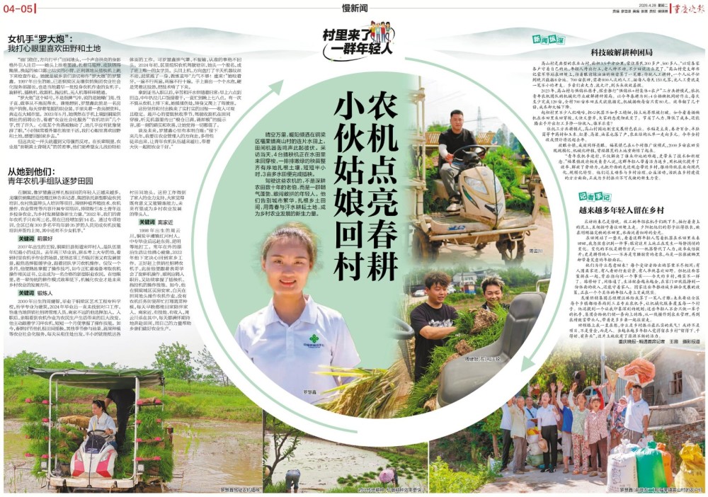 周云川 1998年出生的周云川,铜梁平滩镇红河村人,中专毕业后远赴东莞、昆明等地打工。常年在外的漂泊生活让他满心疲惫,2022年他下定决心回到家乡工作。正好赶上供销社招聘农机手,此前他便跟着表哥学会了旋耕机操作,顺利应聘入职后,又陆续掌握了插秧机、拖拉机的操作技能。如今,他在铜梁城区买房安家,白天在田间地头操作农机作业,没有农机任务时便帮忙打理蔬菜种植,每天早晚都能回家陪伴家人。离家近、有技能、有收入,周云川乐在其中,每天都满怀期待地奔赴田间,用自己的力量帮助乡亲们做好农业生产。 新闻纵深 科技破解耕种困局 高山村是典型的农业山村,面积3.5平方公里,常住居民200多户、500多人。“以前各家各户守着自己的地,年轻人外出打工,老人种不动,不少田就这么荒了。”高山村党支部书记蒙军华站在田埂上,指着眼前绿油油的秧苗算了一笔账:传统人工耕种,一个人从早忙到晚只能插8分地。700亩农田,需要800人次的人工,按每人每天150元算,光人工费就是一笔不小的开支。乡亲们出大力、流大汗,到头来收效甚微。 2023年,高山村与供销社携手,探索推行“供销社+村集体+农户”三方共耕模式,依托青年农机团队的机械化作业破解耕种困局。以今年春耕为例:4台插秧机同时作业,每天至少完成120亩,全村700亩水田五天就能插完,机械插秧每亩只需80元。效率翻了几十倍,成本却大幅下降。 起初村里不少人犯嘀咕,担心机器不如手工精细,怕土地界限被打破。如今看着插秧机在水田里来回穿梭,又快又整齐,大家的态度彻底变了。节省了人力、降低了成本,还能腾出手外出打工多挣一份收入,谁不乐意? 依托三方共耕模式,高山村因地制宜发展特色农业。水稻是主角,卷丹百合、羊肚菌等中药材和玉米、红薯、高粱、油菜也落了户,农业结构从单一走向多元。今年全村收成预计将远超去年。 放眼全镇,成效同样亮眼。福果镇已在6个村推广该模式,2000多亩农田实现规模化、机械化种植,曾经撂荒的土地重新绿了起来。 “青年农机手进村,不仅解决了谁来种地的难题,更带来了新技术和新理念。”福果镇政府相关负责人说,这群年轻人带着活力返乡,用机械化提升了效率、解放了劳动力,也把外面的先进观念带进乡村,推动传统农业向现代化、规模化转型。他们还主动参与乡村治理、公益活动,活跃在乡村建设的方方面面,正成为乡村振兴不可或缺的新生力量。 记者手记 越来越多年轻人留在乡村 采访结束已是傍晚。收工的年轻农机手们跳下车,拍打着身上的泥土,互相招呼着往田埂上走。夕阳把他们的影子拉得很长,映在刚刚插完秧的水田里,水面泛着细碎的金光。 在田间站了一整天,看着这群年轻人驾着机器在水田里来来回回,我忽然意识到一件事:眼前这片土地正在发生一场静悄悄的变化。变化的不仅是耕作方式——机器替代了人力,效率成倍提升;更是耕作的人——不再是弯腰驼背的老农,而是一张张被晒黑却带着笑意的年轻面孔。 他们为什么愿意回来?每个受访者给出的答案不尽相同:有人图离家近、有人看好行业前景、有人单纯喜欢田野。但把这些答案拼在一起,背后指向同一个事实——今天的乡村,确实不一样了。路修好了,网络通了,生活配套越来越全,在家门口就能挣到一份体面的收入,还能守着家人。国家这些年推动城乡融合发展的政策,正在一个个具体的年轻人身上变成现实。 龙瓖供销集团总经理汪林给我算了一笔人才账:未来要让全区每个乡镇都培养两到三名专业农机手,让机械化服务覆盖每一个村子。他还提到一个让我印象深刻的规划:这些年轻人不会只做一辈子的机手,集团会给他们铺一条向上的路,从一线操作到农业管理,再到农村致富带头人,带着更多乡亲一起往前走。 回程路上我一直在想,什么是乡村建设最扎实的底气?或许不是项目、不是资金,而是人。当越来越多年轻人觉得留在乡村“留得下、干得好、有奔头”,这片土地就有了源源不断的活力。 重庆晚报-厢遇首席记者 王薇 摄影报道 编辑:李梓琪 校审:张亚 总值班:杨飞 版面赏析