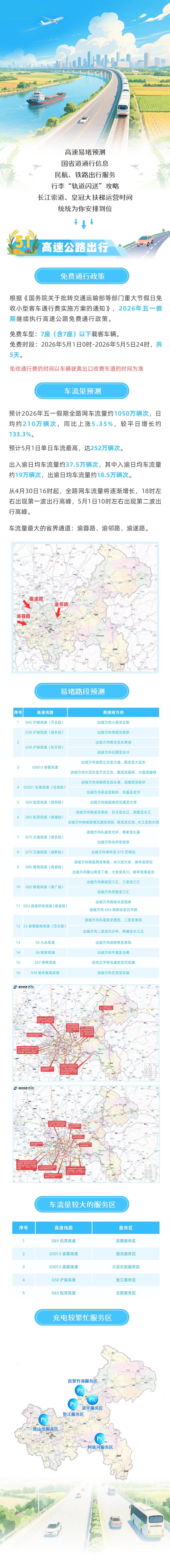 高速公路哪些路段易堵?民航、铁路有哪些出行服务?长江索道、皇冠大扶梯运营时间有无调整……4月27日,市交通运输委发布《“五一”出行服务指南》,准备出行的市民,请收下这份交通指南,合理安排出行时间,做好科学规划。 根据《国务院关于批转交通运输部等部门重大节假日免收小型客车通行费实施方案的通知》,2026年“五一”假期继续执行高速公路免费通行政策。 免费车型:7座(含7座)以下载客车辆;免费时段:2026年5月1日0时-2026年5月5日24时,共5天。 市交通运输委预测,2026年“五一”假期,我市高速公路全路网车流量约1050万辆次,日均车流量约210万辆次,同比上涨5.35%,较平日增长约133.3%。 预计5月1日单日车流最高,达252万辆次,出入渝日均车流量约37.5万辆次,其中入渝日均车流量约19万辆次,出渝日均车流量约18.5万辆次。 据预测,从4月30日16时起,全路网车流量将逐渐增长,18时左右将出现第一波出行高峰;5月1日10时左右,将出现第二波出行高峰。 据介绍,车流量最大的省界通道:渝蓉路、渝邻路、渝遂路。