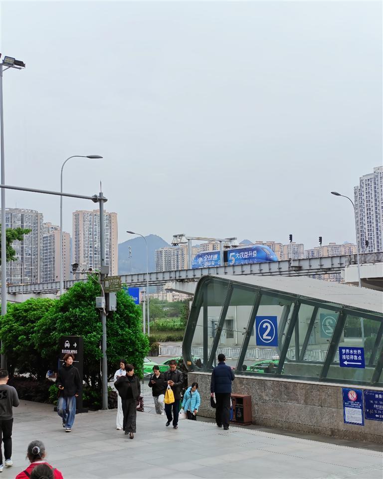 下了地铁,走一会儿就到了狼队竞演中心。 在玉泉湖公园的另一角,是重庆狼队的竞演中心。几个璧山当地的年轻人热情地给记者指路:“就是那个像飞船一样的,到了晚上特别漂亮,好多人来打卡。”其中一位小伙小邓说,每逢比赛日,全国各地的粉丝乘坐地铁来到这里。小邓感慨,对这些全国各地的粉丝们来说,地铁是不二选择——方便、准时,出了站走一会儿就到。 云巴串联起公园城 璧山站外,抬头就能看到云巴。 “05后”的南南和巧巧是一对从大学城过来的情侣,二人刚下云巴,兴奋地对记者说:“我们专门坐地铁过来,再换乘云巴,就像坐观光车一样,感觉整个璧山就是一个大公园。” 几公里外,东岳体育公园是璧山人心中的“运动客厅”。350亩的公园里,11个运动区散落在山水之间,羽毛球场、篮球场、五人制足球场一应俱全。2.4公里的环湖步道上,跑步的人络绎不绝。 事实上,云巴串联起的远不止这两处。从璧山站出发,这条“空中巴士”一路经过秀湖公园、枫香湖儿童公园、古道湾公园、观音塘湿地公园……全长15.4公里的线路上,15座车站将璧山三十余座公园一一串联。 记者手记 把远方拉近,又把日常变得像旅行 傍晚时分,记者乘坐地铁返程。此时,窗外的玉泉湖在暮色中安静下来,云巴在高架轨道上缓缓驶过,像一条流动的光带。璧山这座“公园里的城市”,正在把一种新的生活方式带给每一个坐地铁来到这里的人——不必远行,不必舟车劳顿,出站就是公园,抬脚就能走进风景。 我忽然想起丫丫姐说的那句话:“大家喜欢这种适当的旅途感,又不是太远的地方。”这或许就是轨道尽头最动人的地方——它把远方拉近了,又把日常变得像旅行。 重庆晚报-厢遇首席记者 王薇 实习生 王一钧 摄影报道