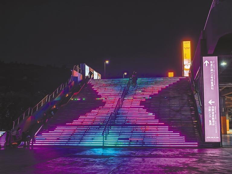 五彩灯光步梯 五彩步梯下的广场上,一群孩子正踩着地面上的“琴键”,蹦跳间“弹奏”出一串串清脆的音符。带着孩子前来游玩的周洁说:“白天工作忙碌,晚上带孩子出来放松玩耍,感觉特别舒心。” 记者看到,这里的游乐设施不少,彩虹滑道、蹦床、小火车等设施一应俱全。“工作日人不多,到周末才真正热闹。”周洁说,周末不少市民专程坐轨道交通带孩子前来玩耍。 夜运动:累并快乐着 夜晚,用一场运动洗去一天的疲惫,是一个不错的选择。在华熙LIVE·鱼洞,随处可见活力满满的运动身影。