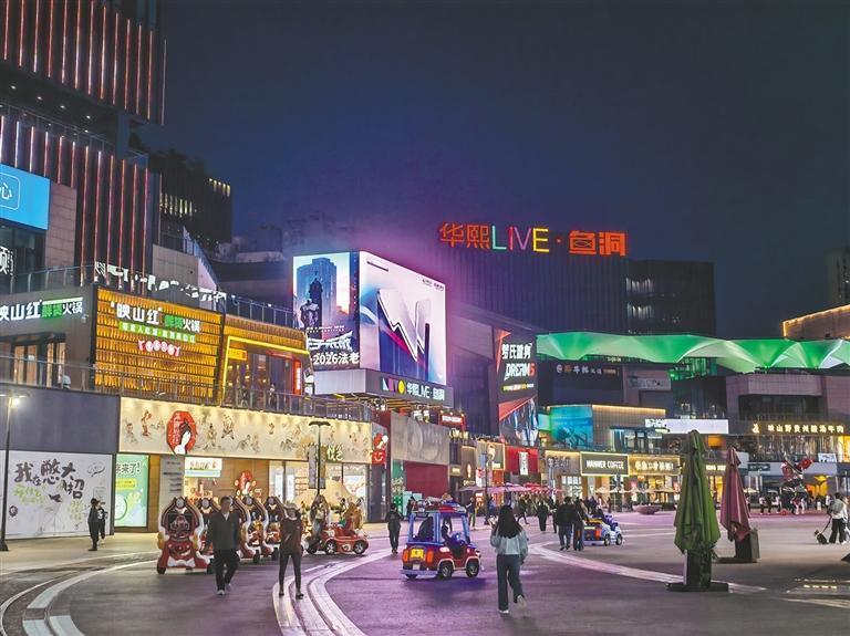 春日傍晚风微凉。重庆晚报记者搭乘轨道交通2号线抵达终点站——鱼洞站。走出车站,夜色下的华熙LIVE·鱼洞,欢声笑语此起彼伏,球场内呐喊声声入耳,美食街区香气弥漫。 鱼洞站是重庆轨道交通2、3号线的起止站,也是人们享受夜生活的热门目的地。站外运动、娱乐、文艺、美食汇聚,勾勒出一幅鲜活滚烫、活力满满的夜生活画卷。 夜枢纽:轨道交通聚客流 3月31日傍晚,夕阳缓缓落下,晚高峰虽已渐退,但鱼洞站的客流依然不小。从这里出站的乘客,有的步履匆匆归家,有的直奔华熙LIVE·鱼洞,开启休闲惬意的夜生活。 顺着导视牌指引,从车站7、8号出入口出站,便是华熙LIVE·鱼洞。作为演唱会、体育赛事的热门举办地,这里至今已累计举办200余场大型文体活动。因此,鱼洞站也成为了一座夜间枢纽。 “平日里,我们车站以通勤客流为主,节奏平稳,可一到比赛、演唱会期间,就会迎来夜间大客流。”鱼洞站值班站长严方敏告诉记者,鱼洞站日均进出站客流约2.8万人次,最火爆的一次单日客流达到了10万人次。