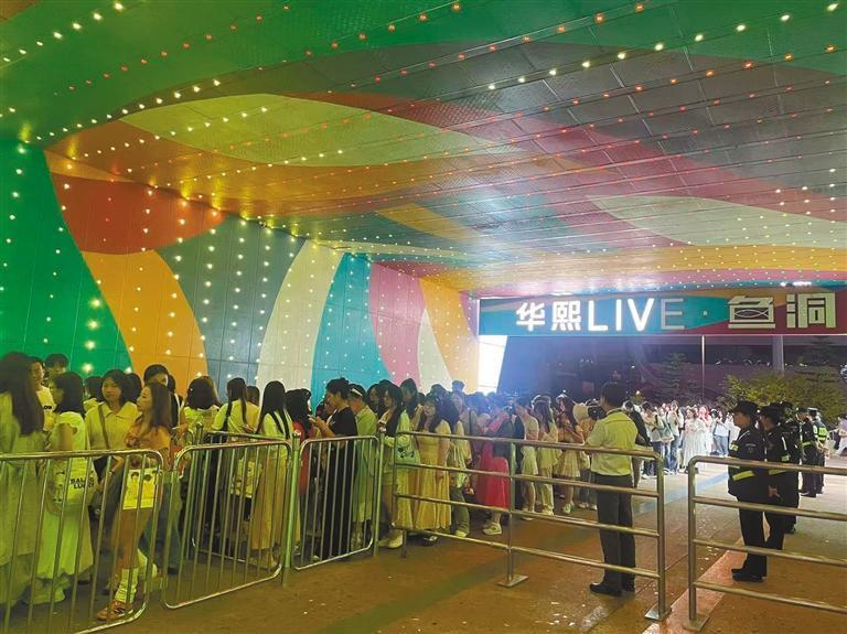 大型活动期间,鱼洞站夜间排队进站的乘客。 据统计,2025年鱼洞站承担的各类演出、赛事大客流运输服务约60场,累计疏散乘客238万人次。严方敏说,每遇大型活动,下午时段轨道交通就将源源不断的客流送往鱼洞,而晚间返程高峰主要集中在9点至10点散场时段。为此,车站还增开安检机、启用4台移动闸机,加派工作人员、布设导流设施科学分流,全力护航夜间出行。 夜娱乐:享受休闲时光 即便没有大型演出赛事,华熙LIVE·鱼洞的夜晚也处处可见休闲游玩的市民。
