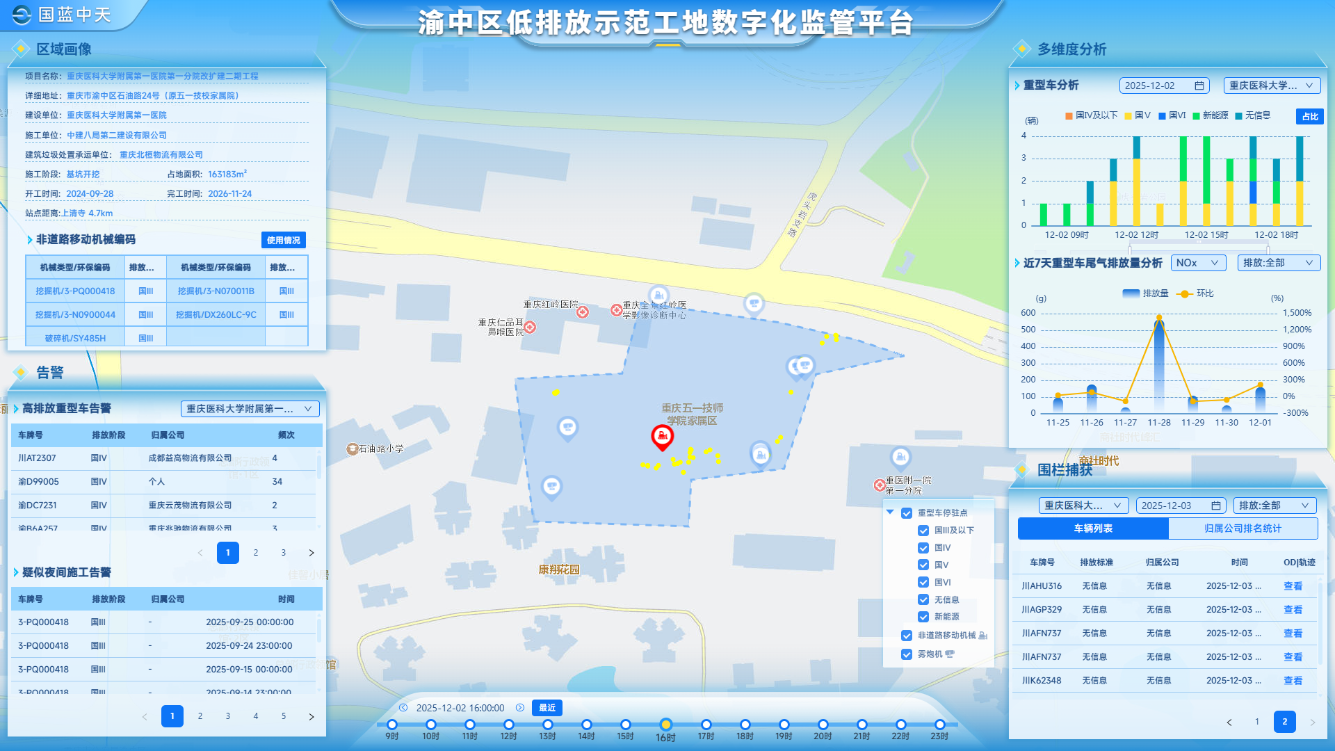 ▲渝中区低排放示范工地数字化监管平台。 记者从渝中区生态环境局了解到,针对这一困境,当地跳出传统监管思维,将数字化转型作为突破口,聚焦移动源污染防控,以重医附一院第一分院改扩建二期工程为试点,探索构建“智慧感知、精准监管、协同治理”的低排放数字监管新范式,为核心城区施工的生态环境监管提供全新解决方案。 智慧赋能: 构建三维数字监管新体系 破解监管难题,技术创新是核心密钥。渝中区依托数字重庆IRS平台,整合多维度数据资源,打造了一套“重型柴油车+非道路移动机械+电子围栏”的三维智慧治理系统,让监管变得“耳聪目明”。 在数据融合的基础上,一套会“思考”的“智慧引擎”应运而生。系统汇聚了17万辆重型货车的实时轨迹数据,接入交通、住建、生态环境等多部门的车辆排放阶段、年检情况、工地基础信息等多元数据,通过机器学习将“数据资产”转化为“监管智能生产力”,实现对违规行为的精准预判与识别。 实时多源感知技术让违规行为无处遁形。借鉴智能驾驶的技术思路,系统采用“视频图像+机载传感器”的创新方案,通过先进算法对作业现场进行7×24小时全天候、无死角监控,自动识别未密闭运输、带泥上路、冒黑烟等违规行为,真正做到“违规即发现”。 GIS技术划定的电子围栏,构筑起一道“数字边界”。当渣土运输车或非道路移动机械进入施工区域时,系统便依托实时定位数据与AI算法,自动核查车辆作业情况,如是否开启环保装置、是否超时夜间施工、是否违规闯禁等,实现“违规即发现、数据即证据”的秒级响应。而通过“大数据+AI”对车辆轨迹的深度解析,还能精准识别装载、倾倒点位及行驶规律,为风险预警提供有力支撑。 多跨协同机制则打通了监管“最后一公里”。系统联动公安、城管、住建、生态环境等多部门,建立违规事件快速响应与联动处置机制,实现土石方作业全生命周期监管,既提升了执法效能,又降低了行政成本,做到对施工单位“无事不扰”。 成效彰显: 从试点突破到全域拓展