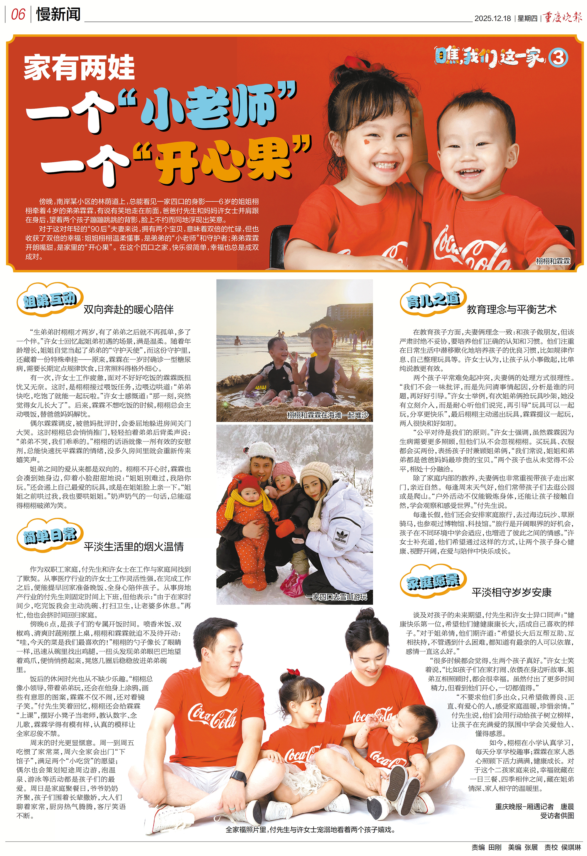 ▲一家四口去雪山游玩 “很多时候都会觉得,生两个孩子真好。”许女士笑着说,“比如孩子们在家打闹、依偎在身边听故事、姐弟互相照顾时,都会很幸福。虽然付出了更多时间精力,但看到他们开心,一切都值得。” “不要求他们多出众,只希望做善良、正直、有爱心的人,感受家庭温暖,珍惜亲情。”付先生说,他们会用行动给孩子树立榜样,让孩子在充满爱的氛围中学会关爱他人、懂得感恩。 如今,栩栩在小学认真学习,每天分享学校趣事;霖霖在家人悉心照顾下活力满满,健康成长。对于这个二孩家庭来说,幸福就藏在一日三餐、四季相伴之间,藏在姐弟情深、家人相守的温暖里。重庆晚报-厢遇记者 唐晨 受访者供图 往期回顾: 编辑:戴林 校审:罗再芳 总值班:周圆 重庆晚报报版鉴赏